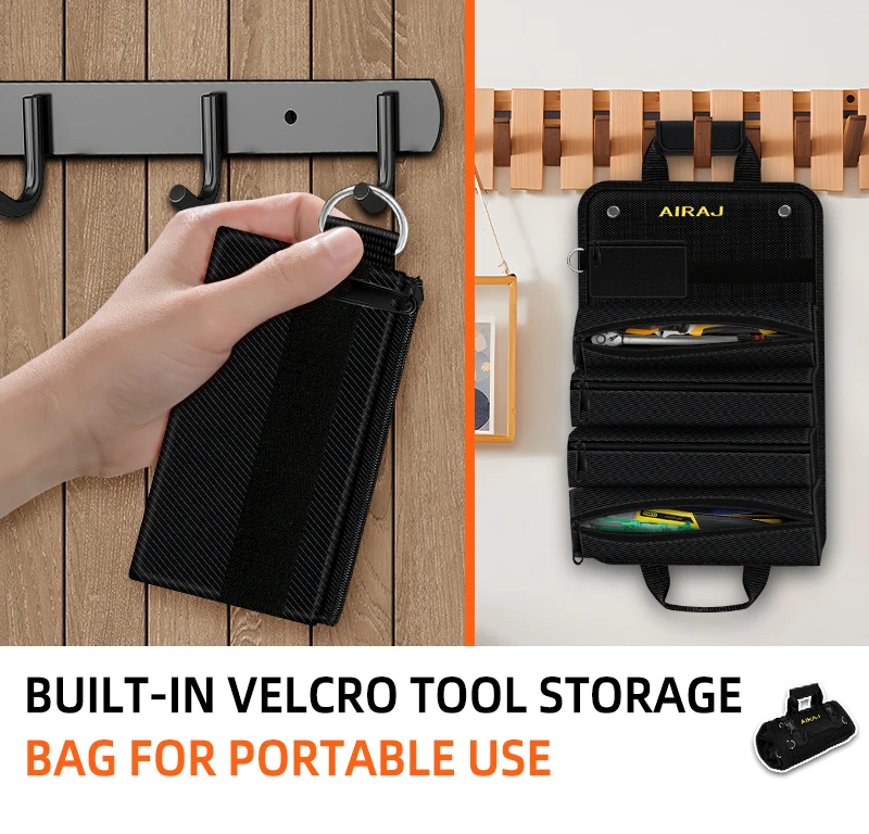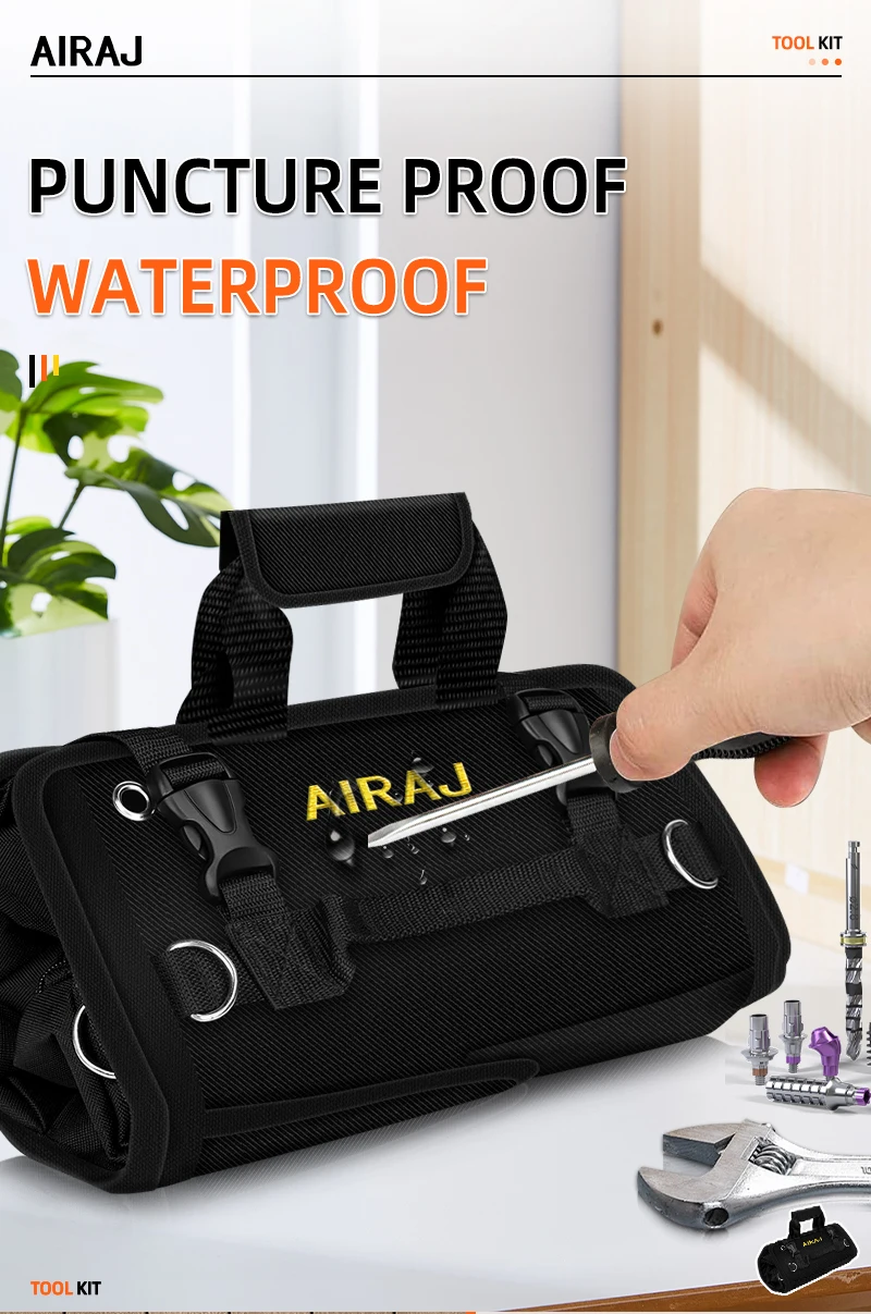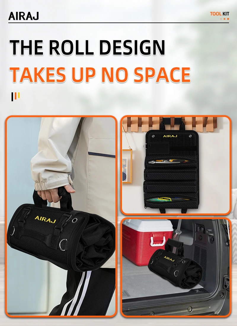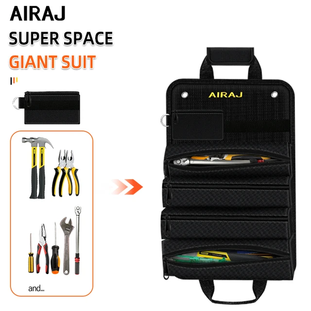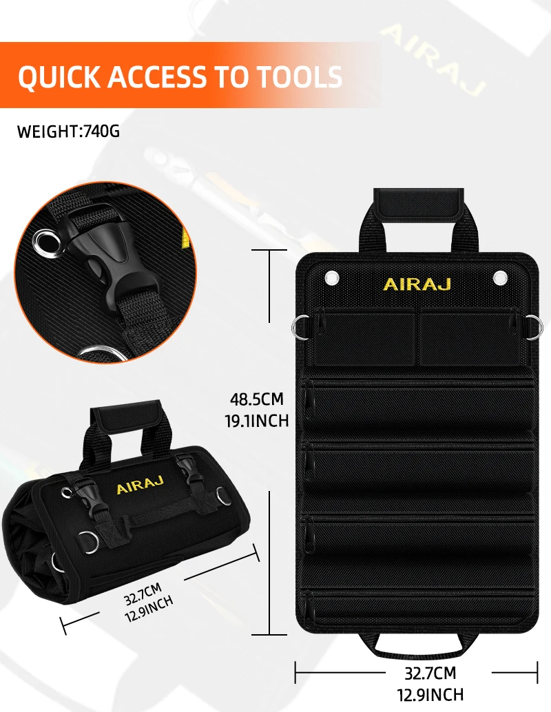 The AIRAJ 18 inch Roll-Up Tool Bag boasts a large capacity with 4 fixed large pockets and 2 detachable small pockets, perfect for organizing various tools.