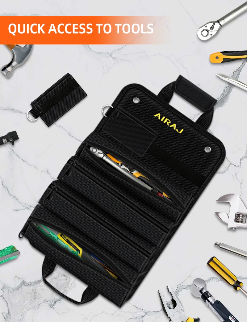 AIRAJ 18 inch Roll-Up Tool Bag 4 fixed large pockets and 2 detachable small pockets,Oxford Fabric Multi-Tool