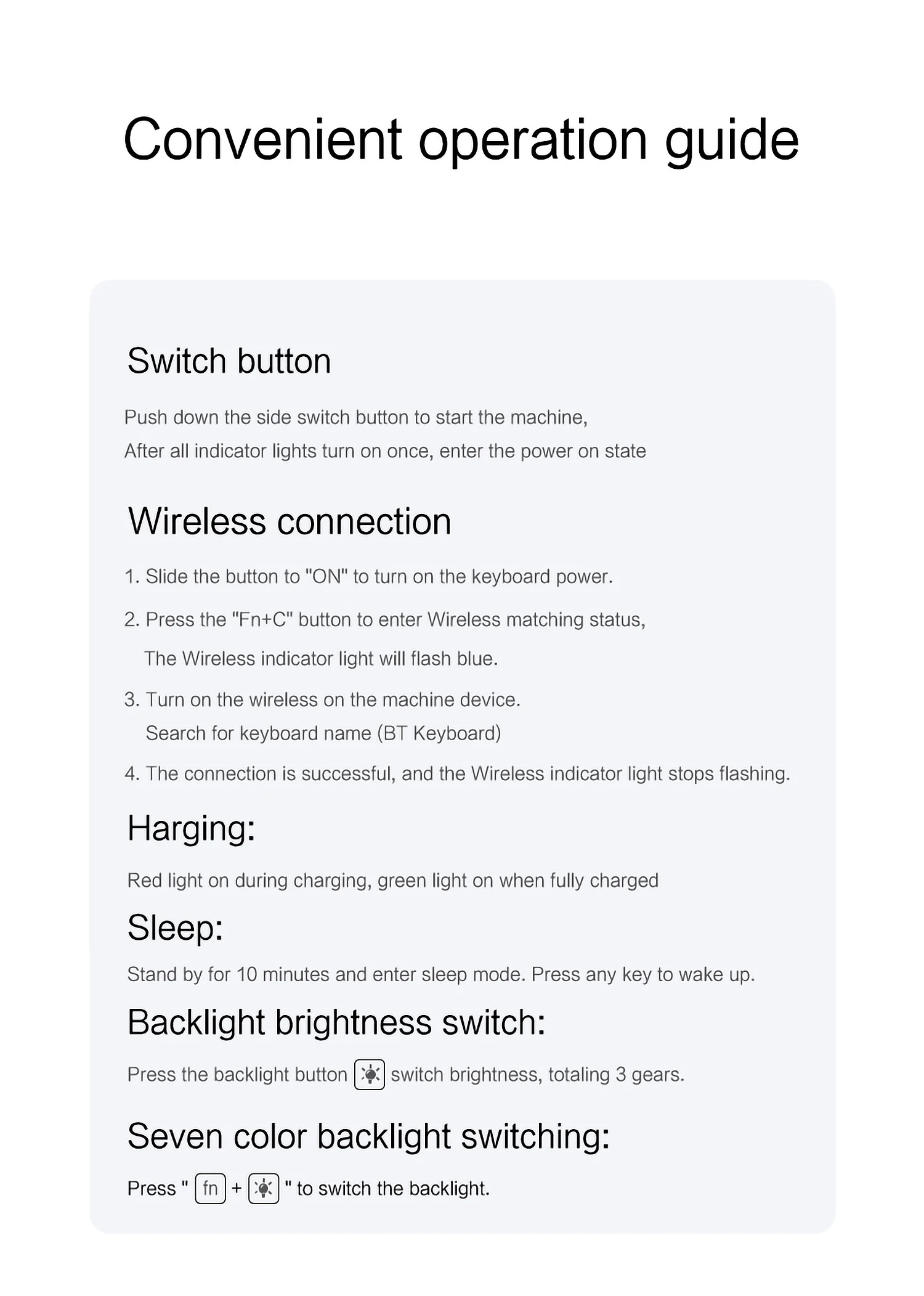 【1】Bluetooth connection method: Turn on the keyboard switch, then hold down Fn+C for about 2-3 seconds to start Bluetooth, then turn on your tablet Bluetooth device, search for “BT Keyboard”, and click connect to connect 。