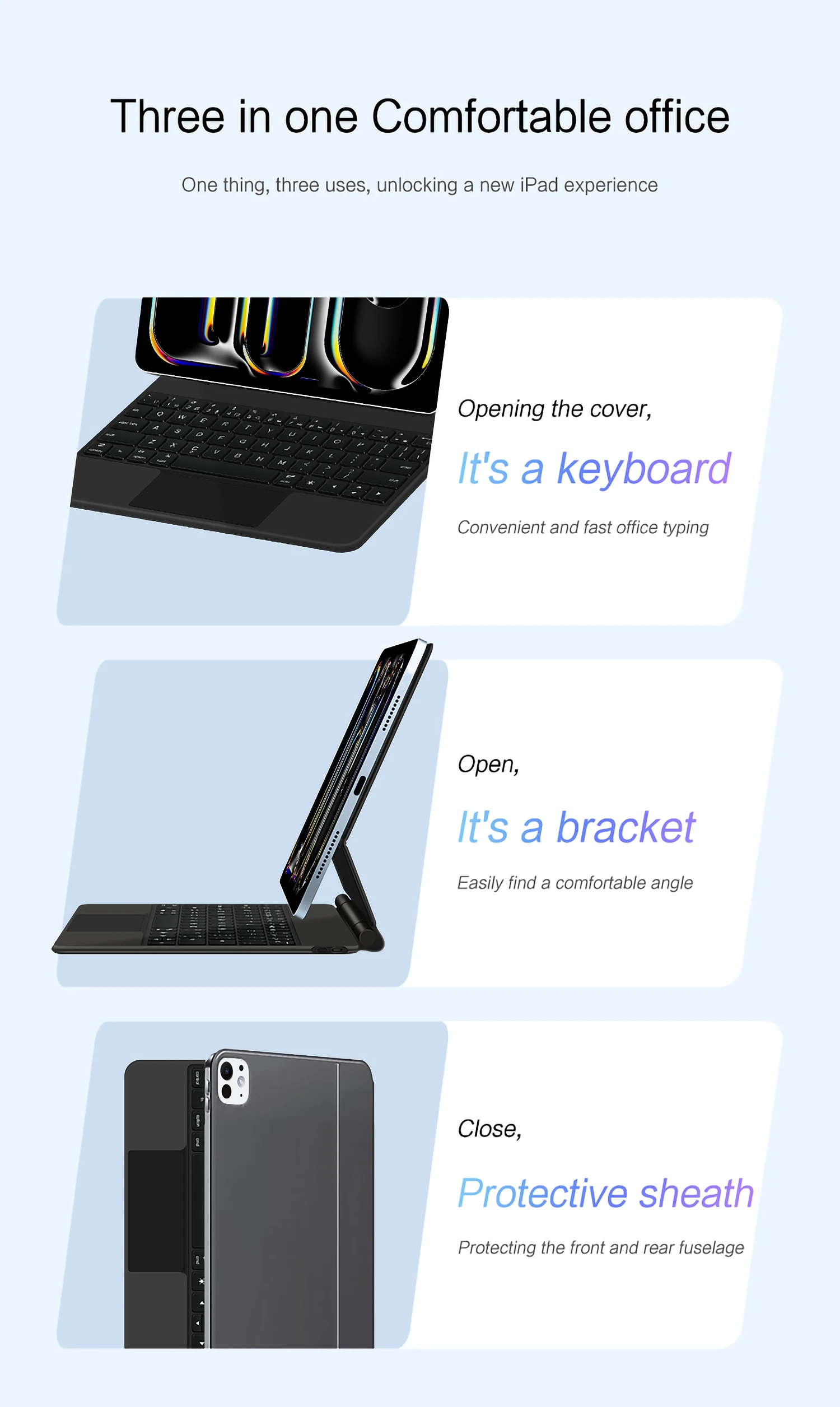 One product ,dual uses,when unfolded , it is a Tablet Keyboard,and when closed,it is a protective Case,non-removable,enabling it to meet the needs of more scenarios