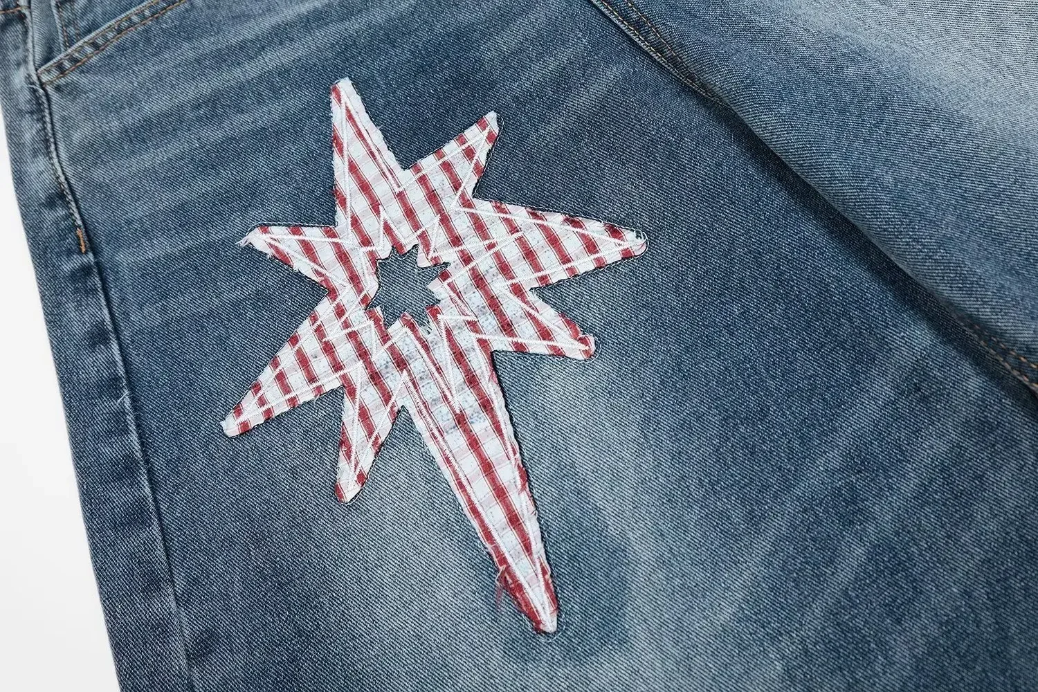 • Star Paste Cat Whiskers Scimitar : The unique star paste cat whiskers scimitar design adds a playful touch to these classic straight leg jeans.
