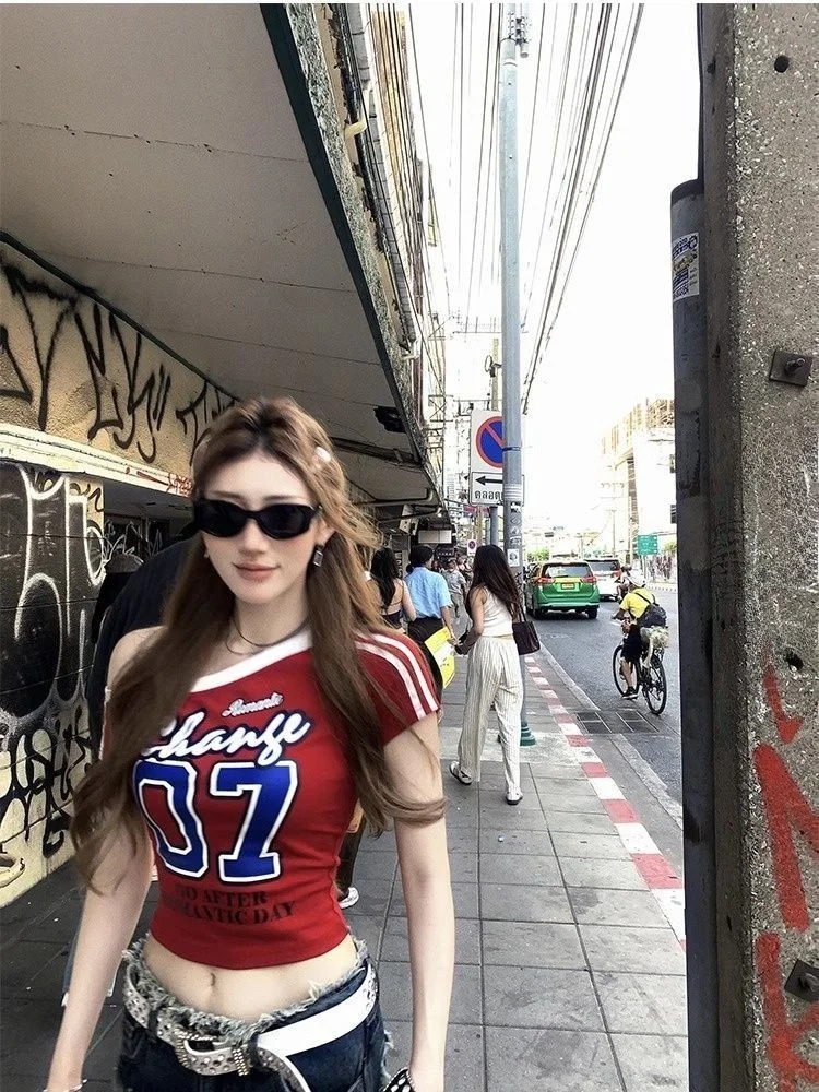 Embrace the bold American pure desire style with this hot girl stripe T-shirt, perfect for summer.
