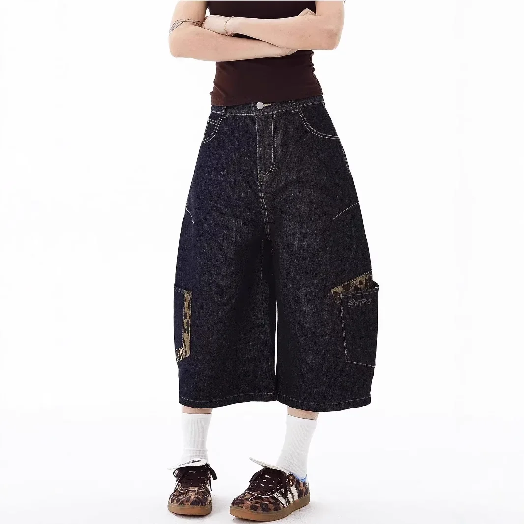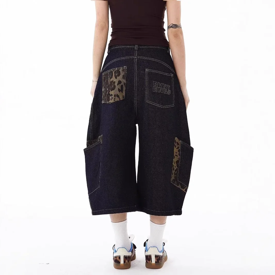 American Retro Leopard Print Pocket Knife Jeans Loose Wide Leg Workwear Seven Pants Casual Style for