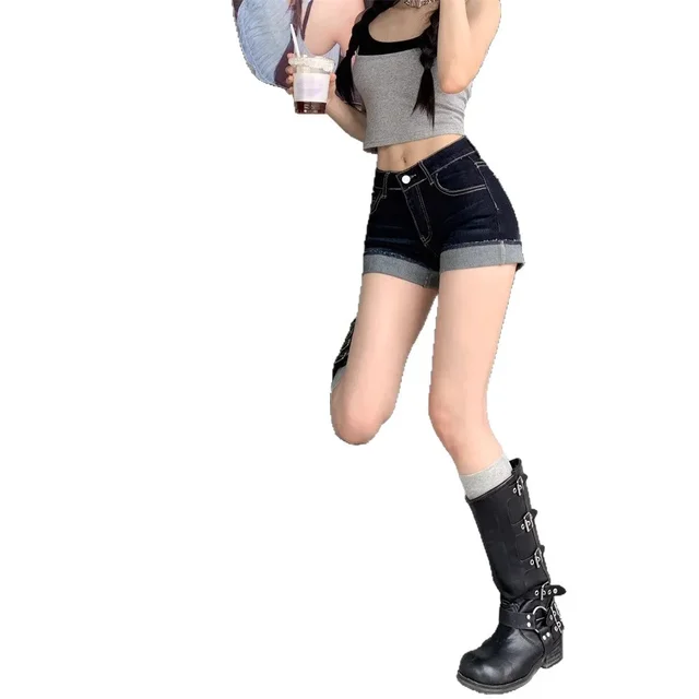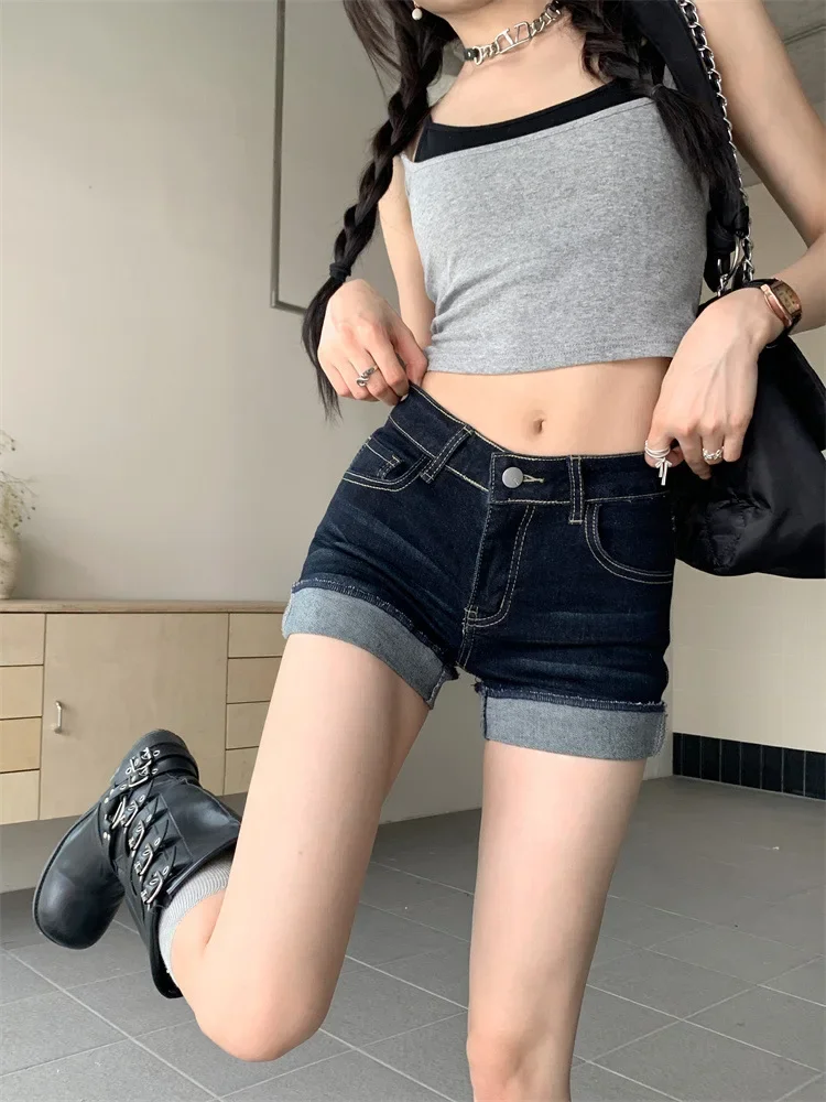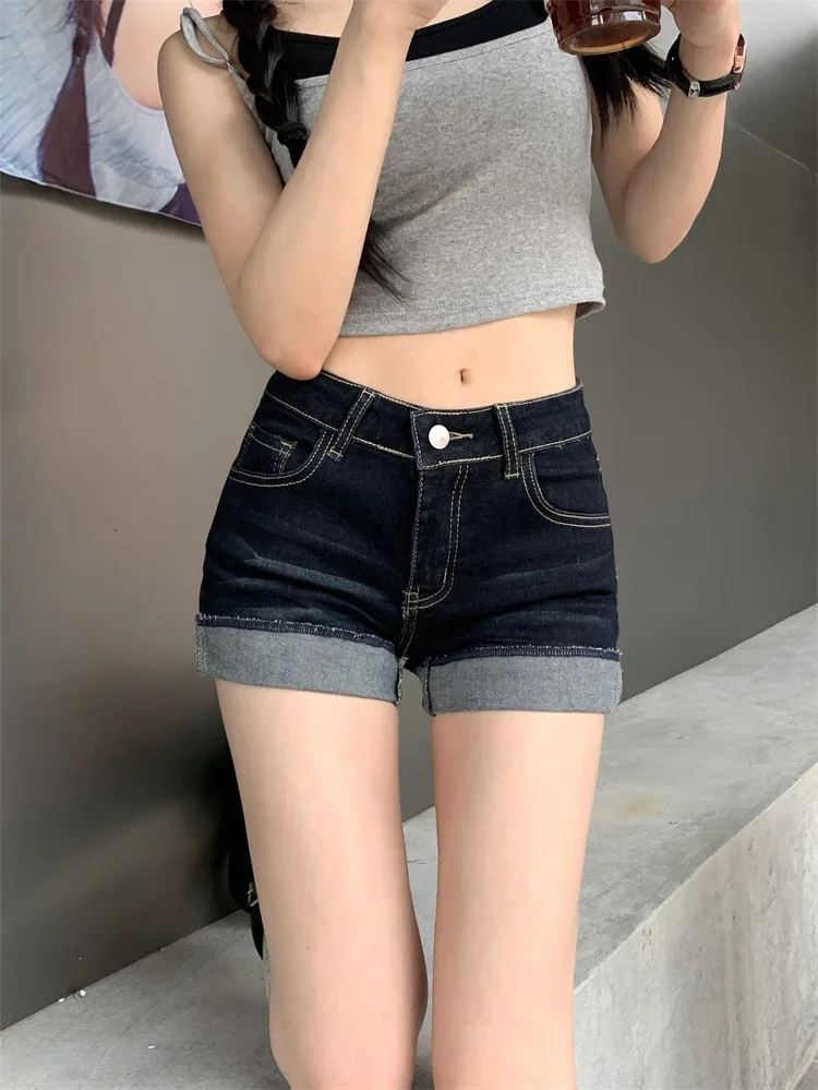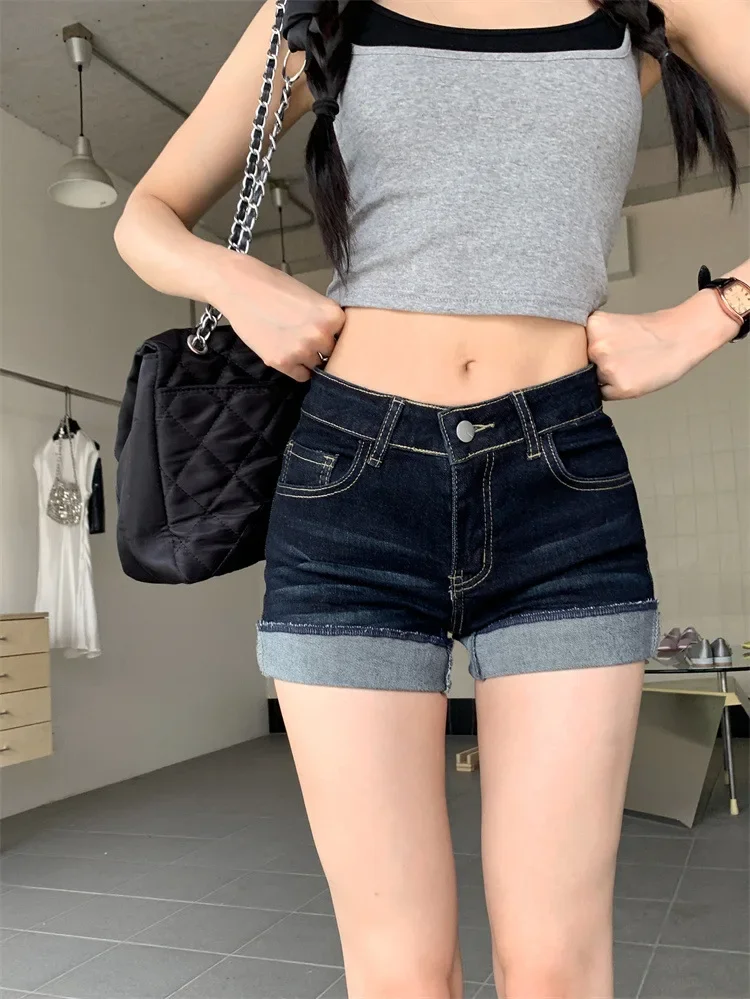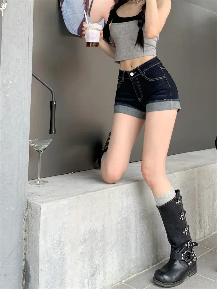 American Style Hot Girl High Waist Sexy Super Short Jeans Shorts Women Summer Deep Blue Design Cuffed Short Pants