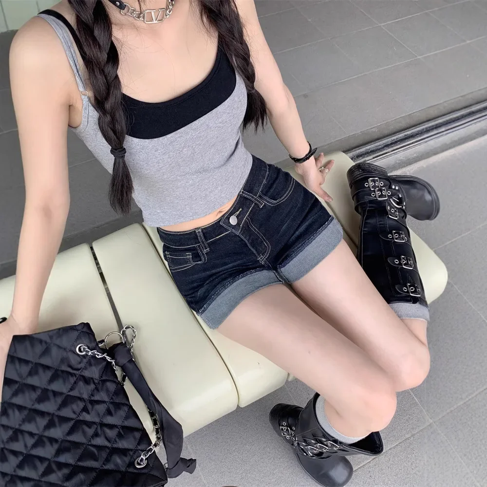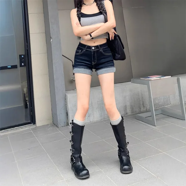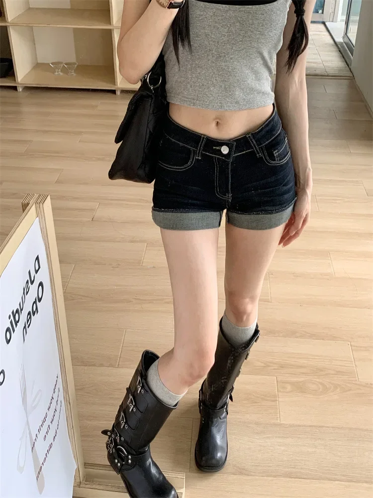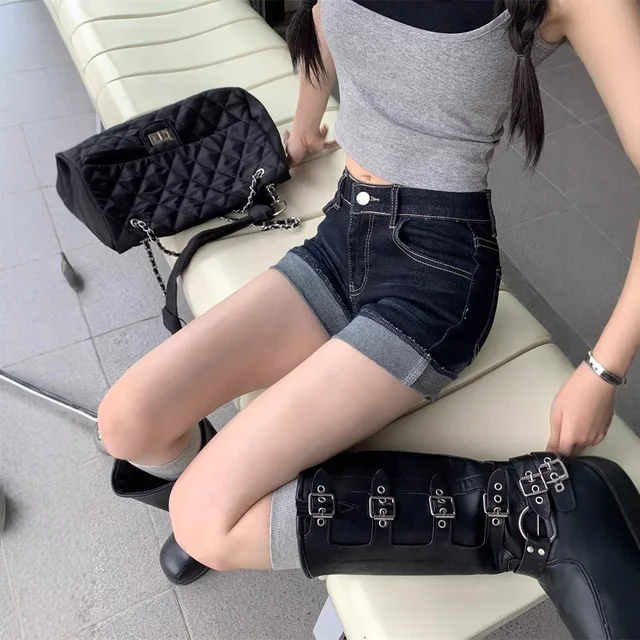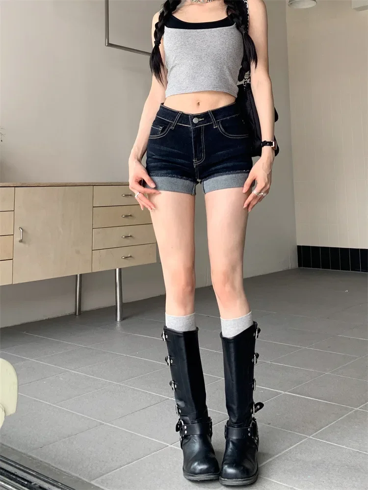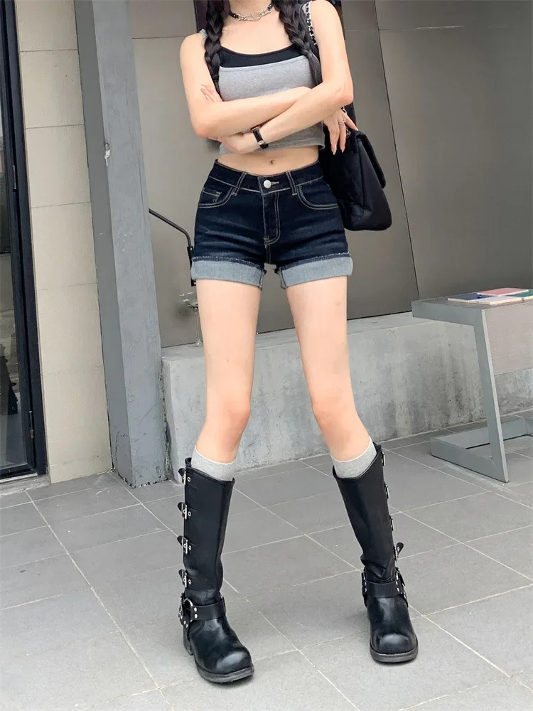 American Style Hot Girl High Waist Sexy Super Short Jeans Shorts Women Summer Deep Blue Design Cuffed Short Pants