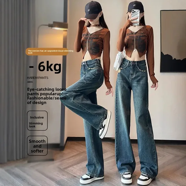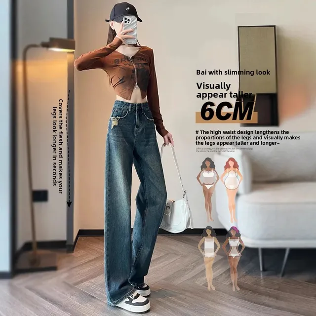 American Style Light Wash Slim Wide Leg Jeans Women High Waist Slimming Drapey Loose Straight Floor-Length