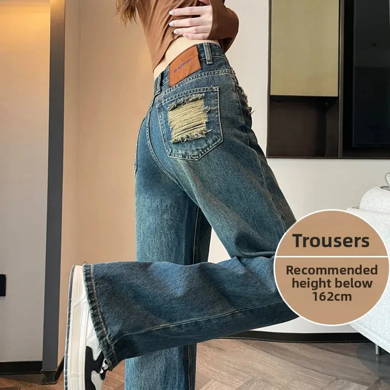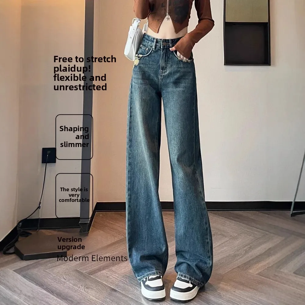 American Style Light Wash Slim Wide Leg Jeans Women High Waist Slimming Drapey Loose Straight Floor-Length Pants