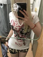American Y2K Design V-Ne ort Sve T-irt Women Summer Pure Desire Slim Fit ort Printed Sweet And Spicy Top