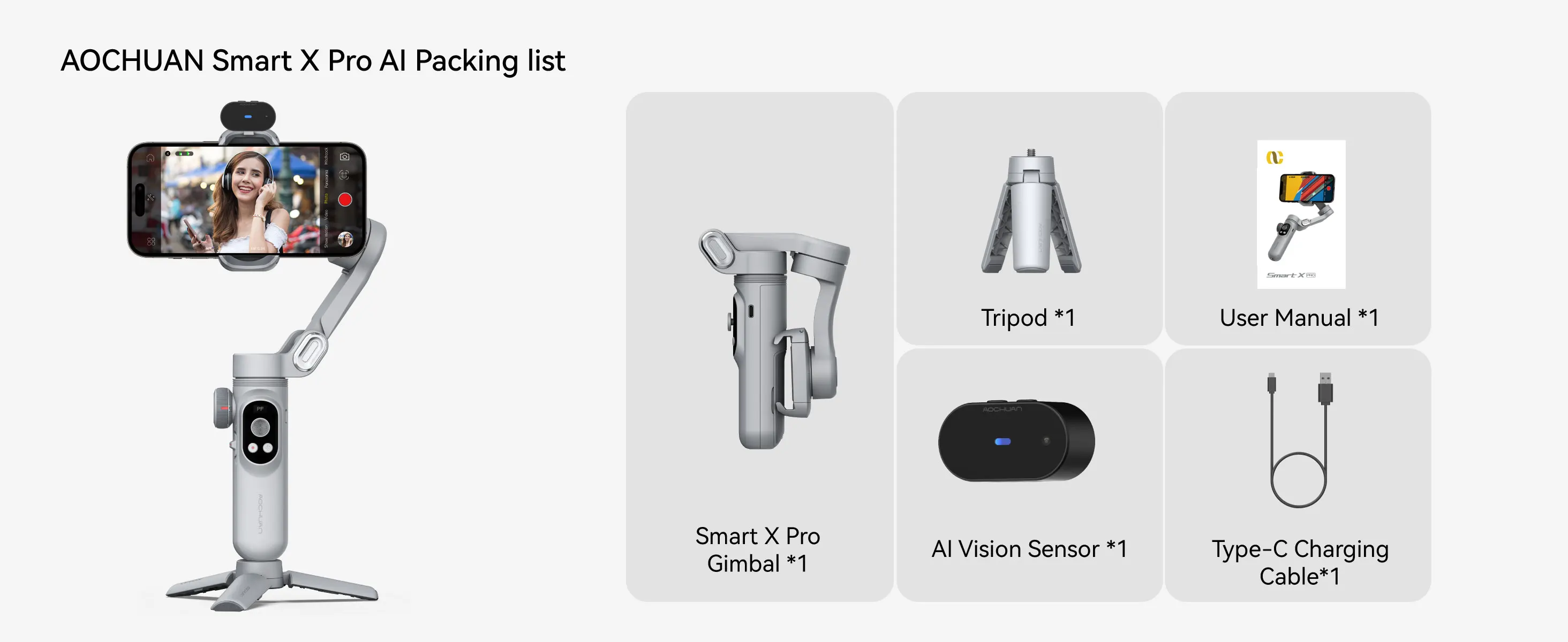 【Packing List and Services】1×AOCHUAN SMART X Pro gimbal (phone not included), 1×AI tracking sensor, 1×Tripod, 1×USB-C charging cable, 1×User Manual.