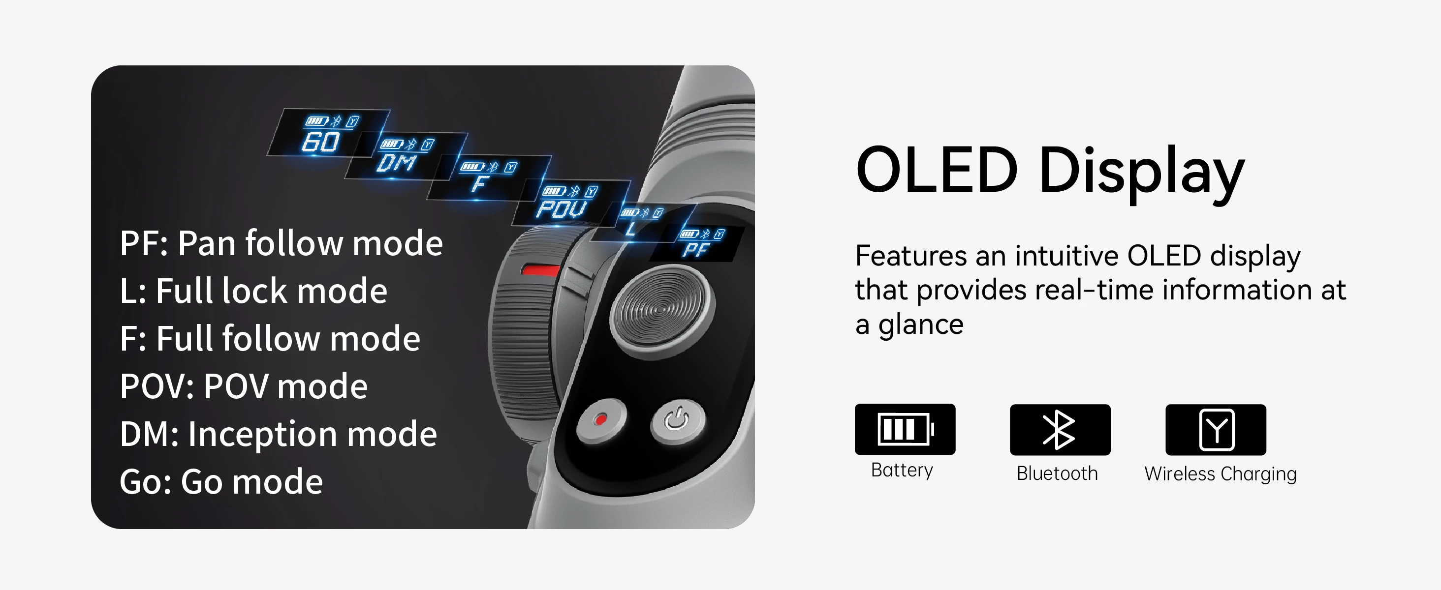 【OLED Display&Replaceable battery】OLED display allows you to more intuitively check the gimbal stabilizer’s battery status, Bluetooth connection, shooting mode, etc. This gimbal is designed with a detachable battery compartment, so you can directly replace the battery when it runs out of power, saving charging time and allowing you to shoot unimpeded when you are outdoors and cannot charge.