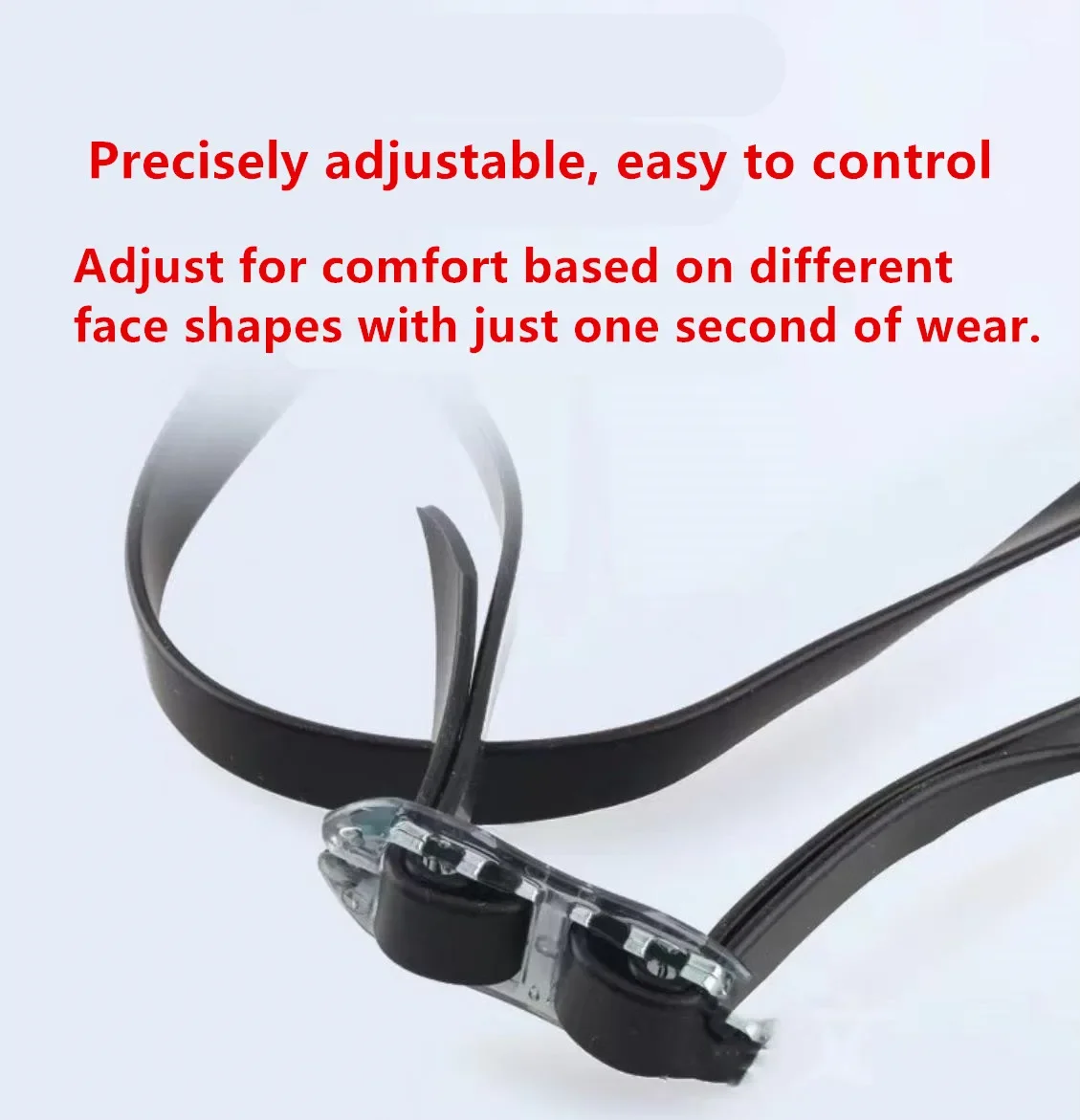 “translation”: “Detail design: Ultra-thin silicone sealing rings fit closely around the eyes, providing water resistance and preventing leaks, eliminating the need for frequent adjustments; adjustable dual toggle straps ensure stability and prevent slipping, suitable for high-intensity competition needs.