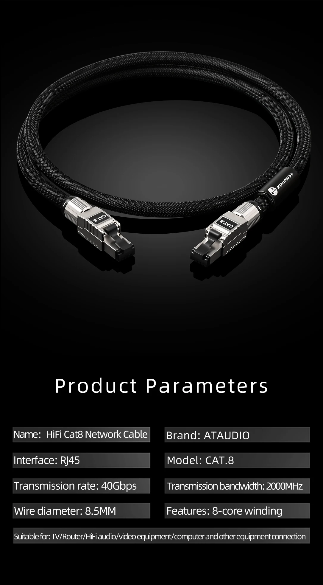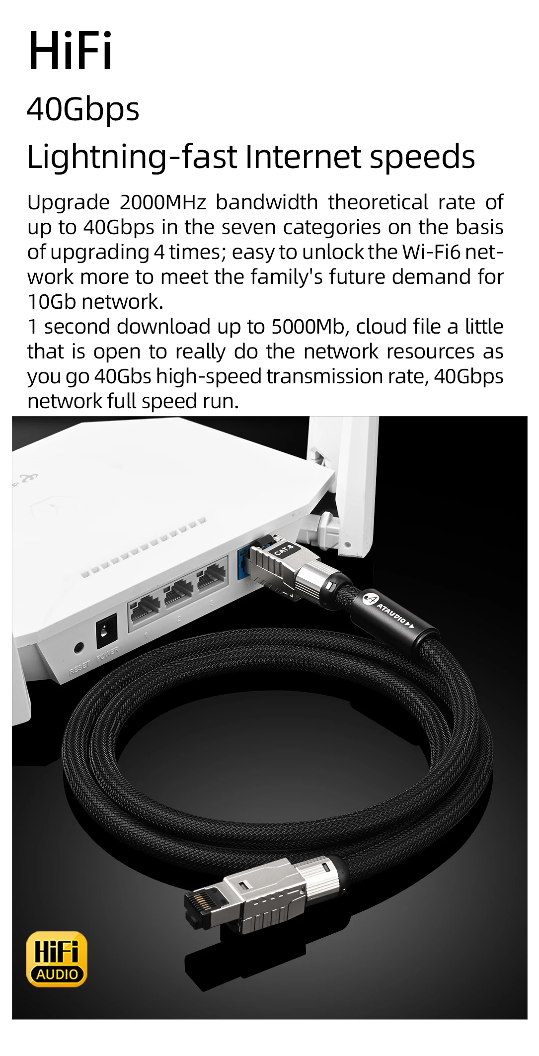 ATAUDIO CAT8 Internet Cord 40Gbps HiFi Ethernet Cable Gaming-grade Network Cable for Laptop TV Router