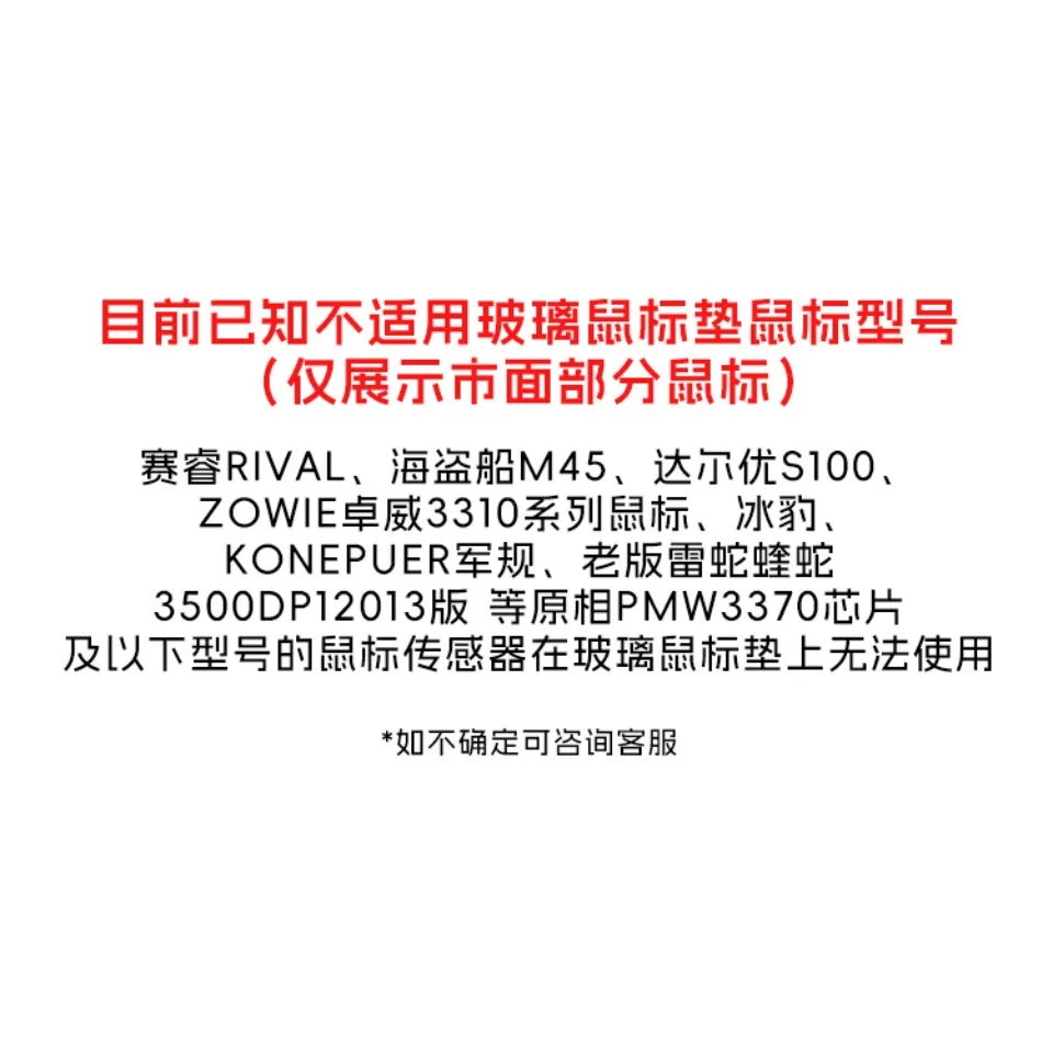 The original PMW3370 chip and the following models of mouse sensors, such as Steelseries RIVAL, Corsair M45, Dareu S100, ZOWIE 3310 series mouse, ROCCAT, KONEPUER military regulations, old version Razer Bee 3500DP1, 2013 version, etc., cannot be used on glass mouse pads