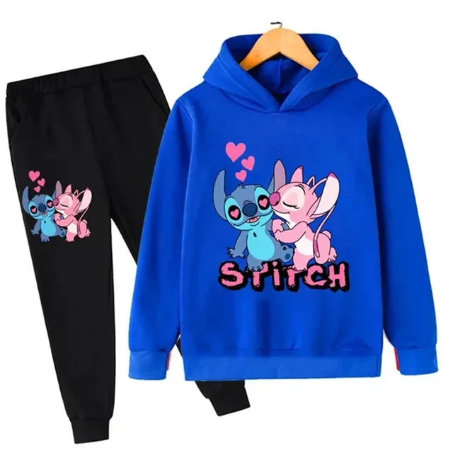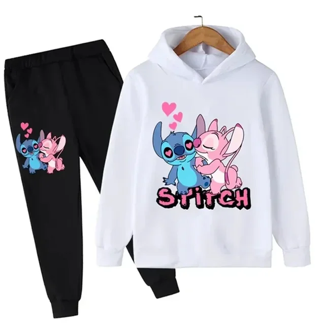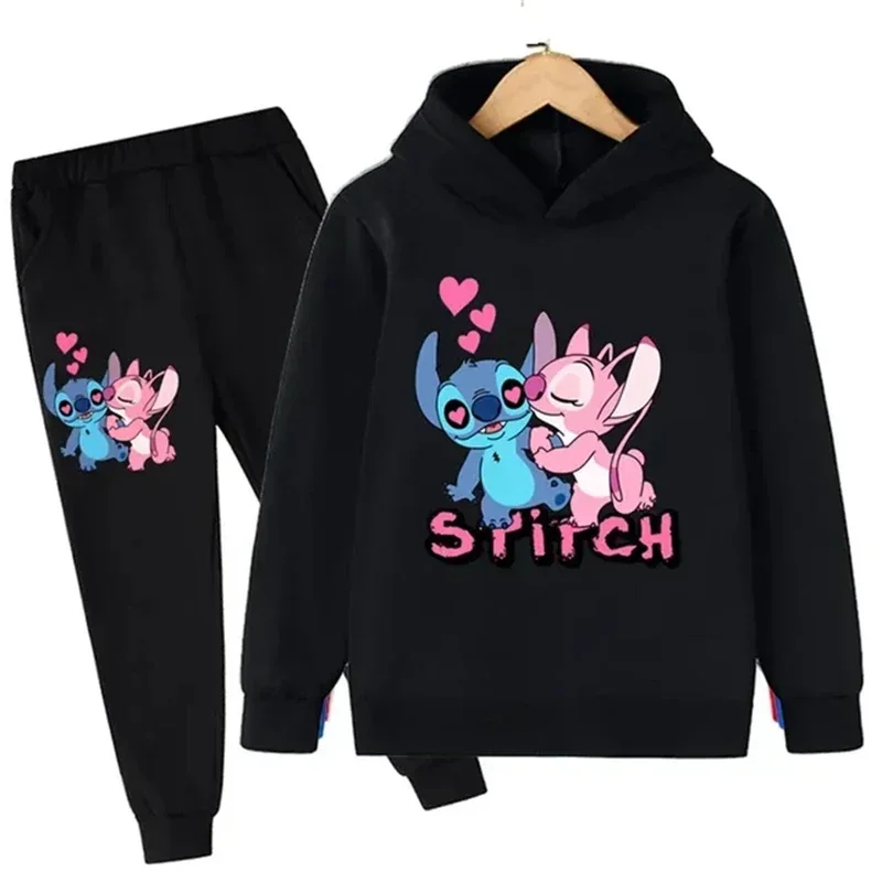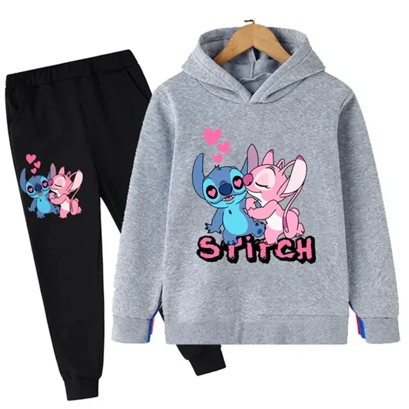 Autumn and Winter Children Disney Cute Stitch Print Hooded Sweatshirt Suit Boys Girls Casual Comfortable Long Sleeve + Pants Set