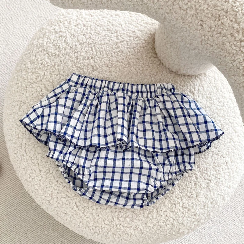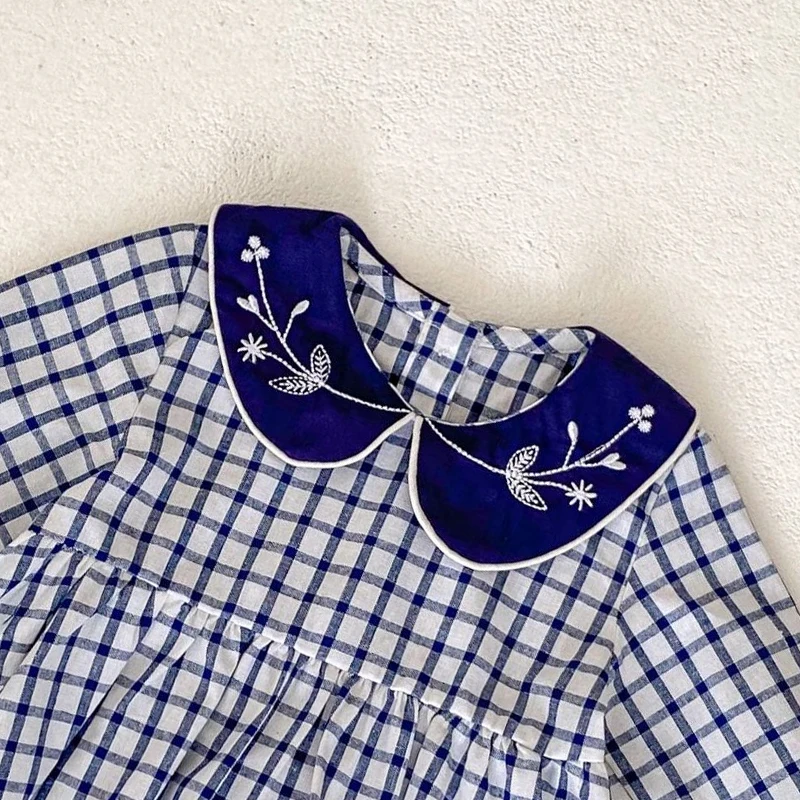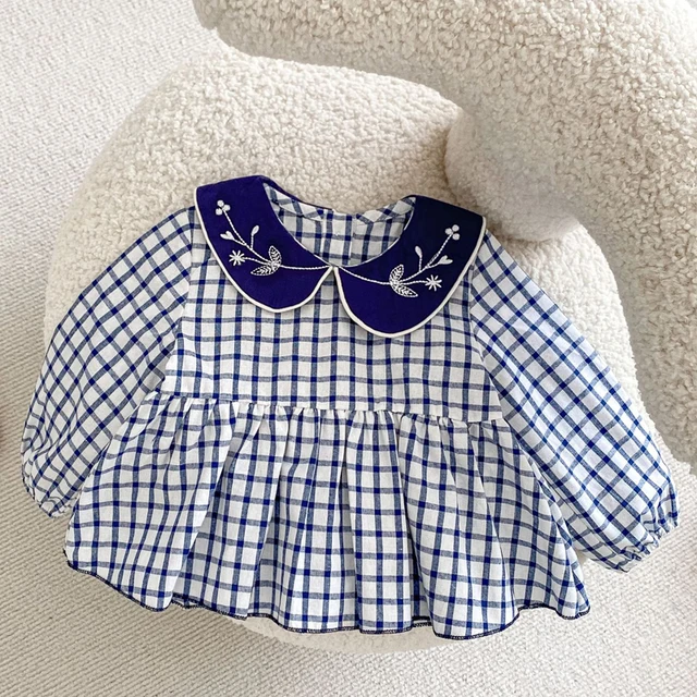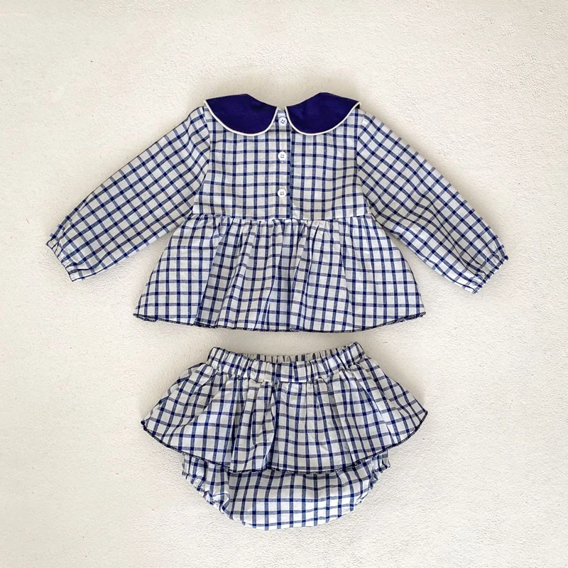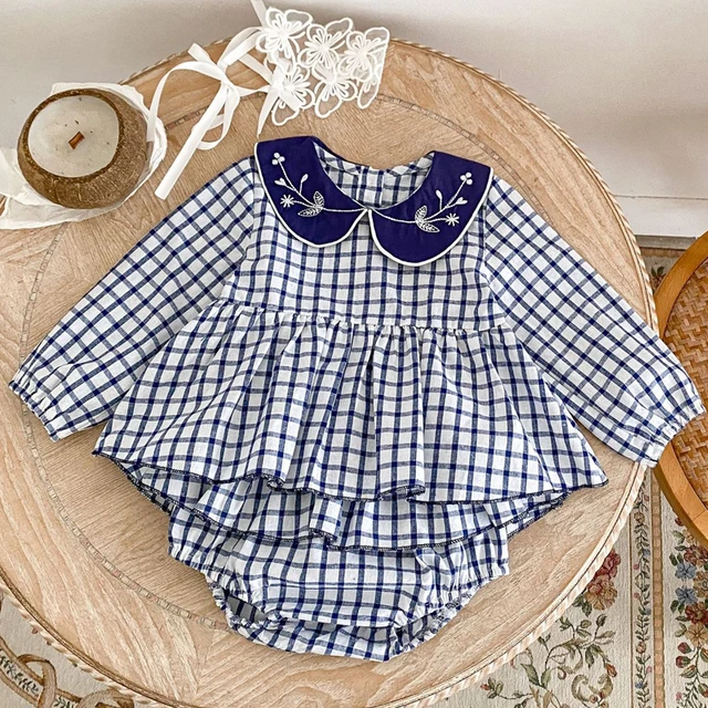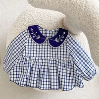 Autumn new baby clothing, 0-3 year old female baby, doll collar embroidered checkered top+skirt skirt