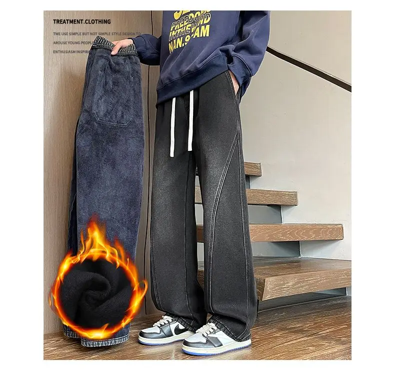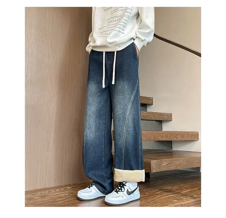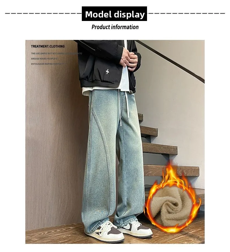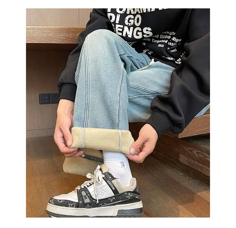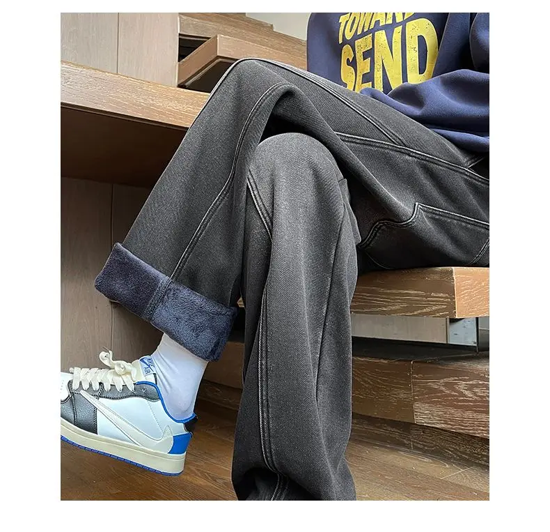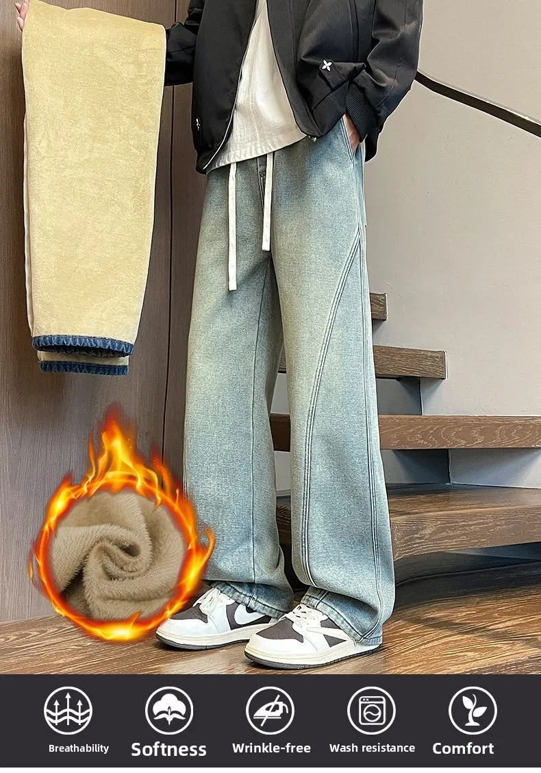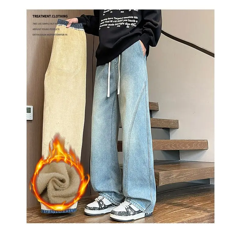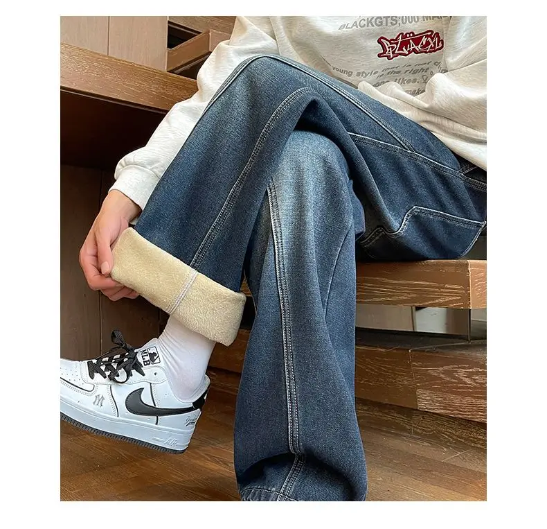 Autumn Winter Fleece New Men’s Thicken Jeans Micro Elastic Loose Straight Tube High Street Men’s