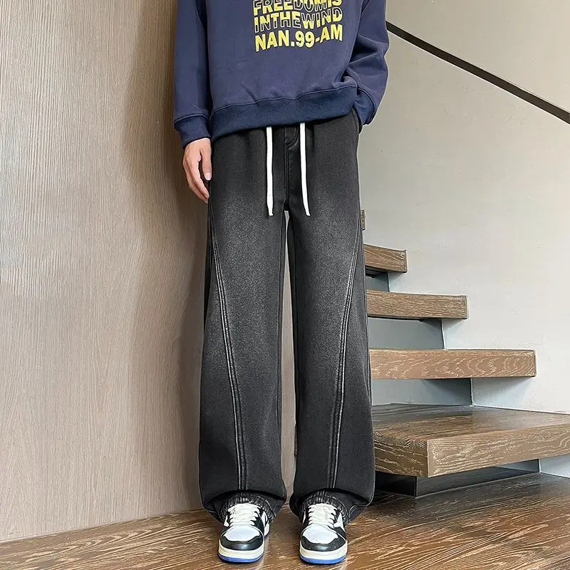 Autumn Winter Fleece New Men’s Thicken Jeans Micro Elastic Loose Straight Tube High Street Men’s