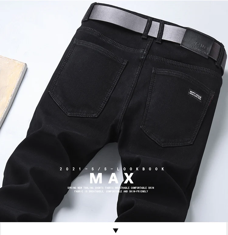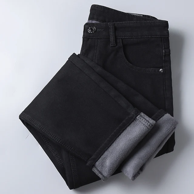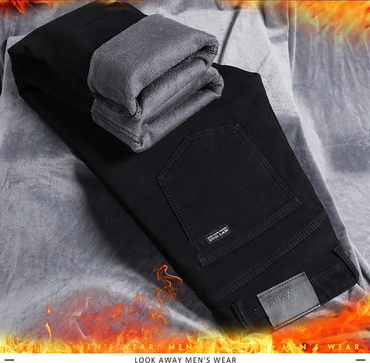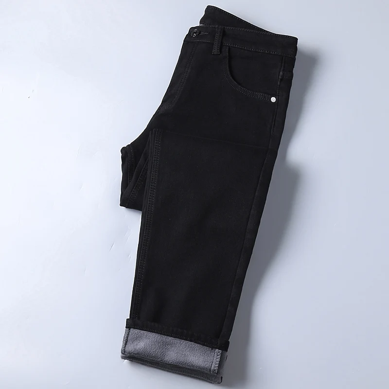 Autumn Winter Fleece Stretch Jeans Black Fashion Slim Comfortable Cotton Straight Trousers Warm Male
