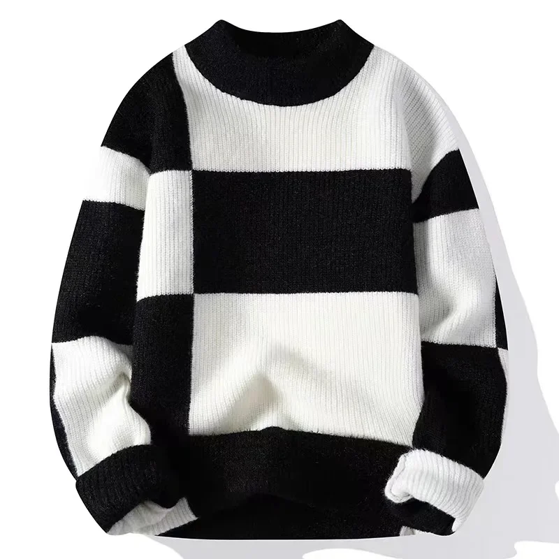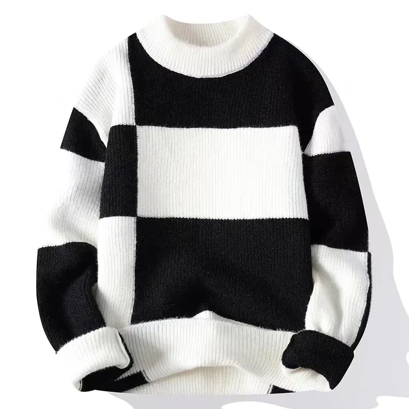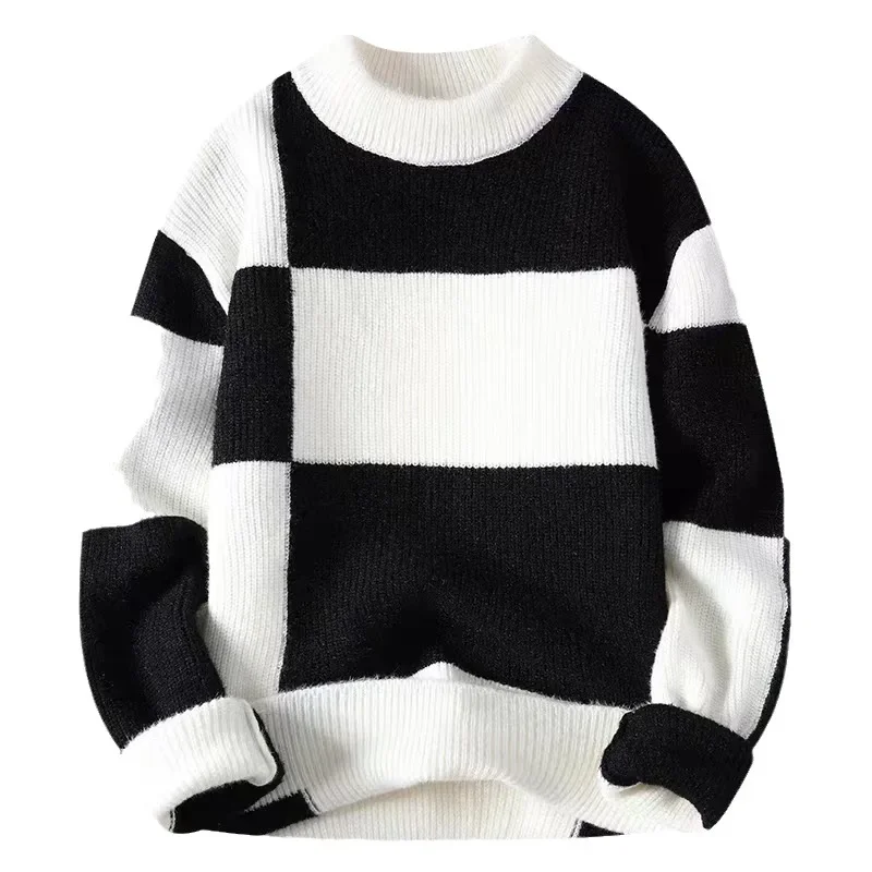 Autumn Winter Men’s Casual Knitted Half High Collar Base Shirt Teenage Trendy Color Block Sweater