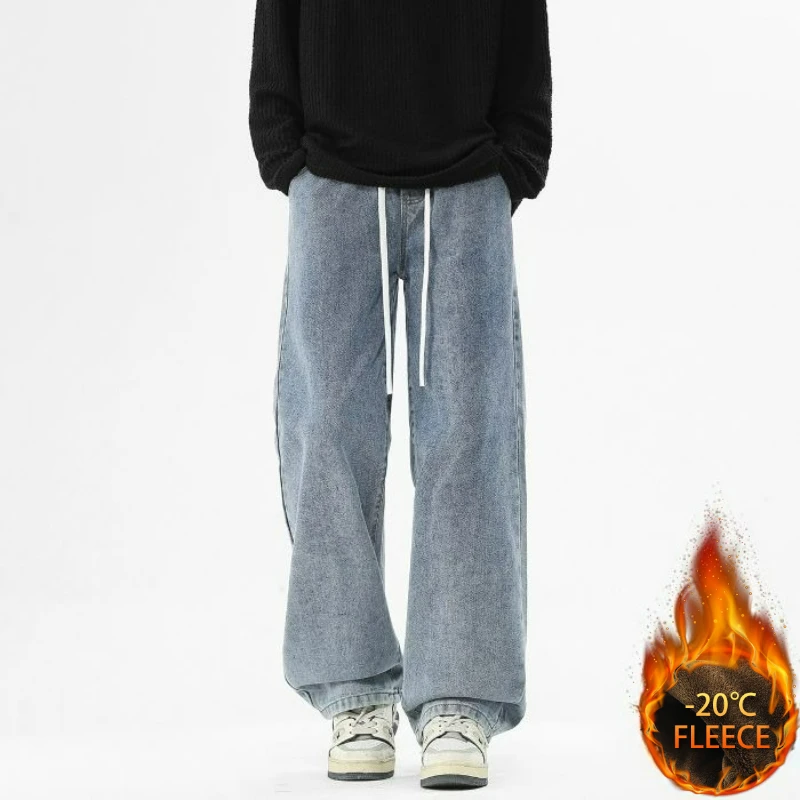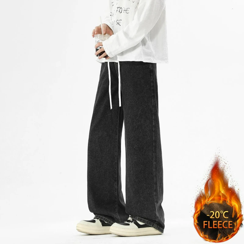 Autumn Winter Men’s Fleece Thicken Jeans Business Casual Vintage Straight Denim Pants Male Wool