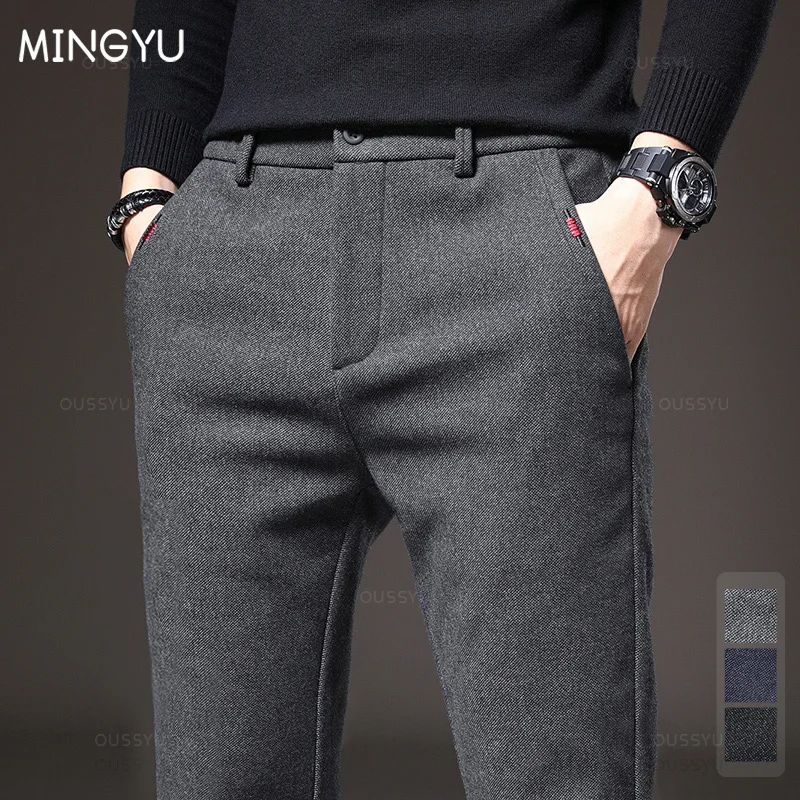 Autumn Winter New Classic Casual Pants Men Thick Business Korea Slim Fit Stretch Gray Blue Black Brushed