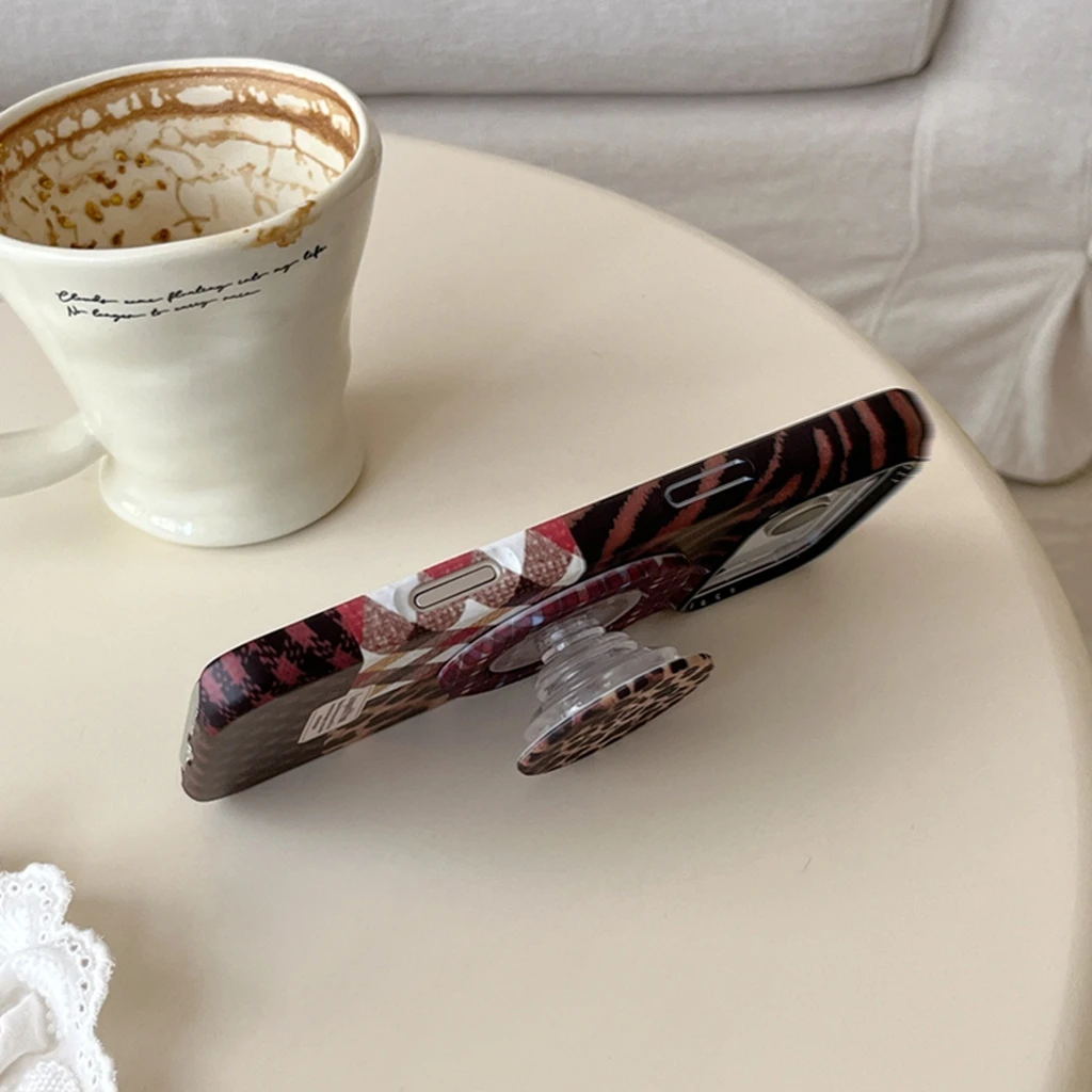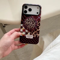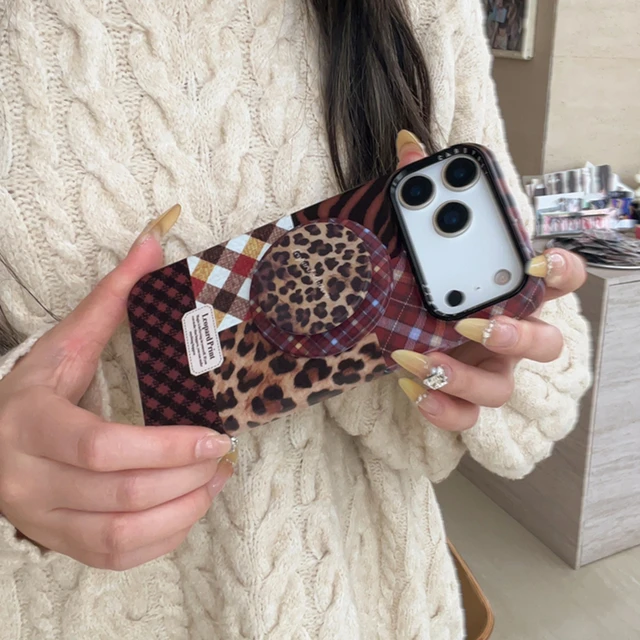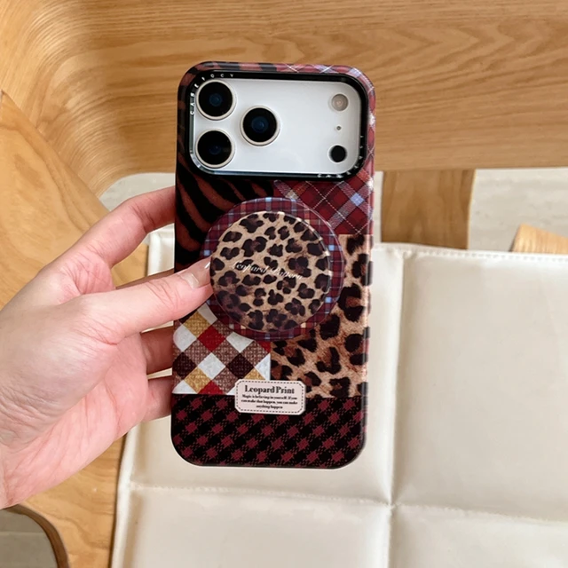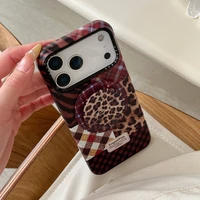Autumn Winter Retro Leopard Print Grid Pattern Splicing With Holder Magnetic Phone Cover Case for iPhone