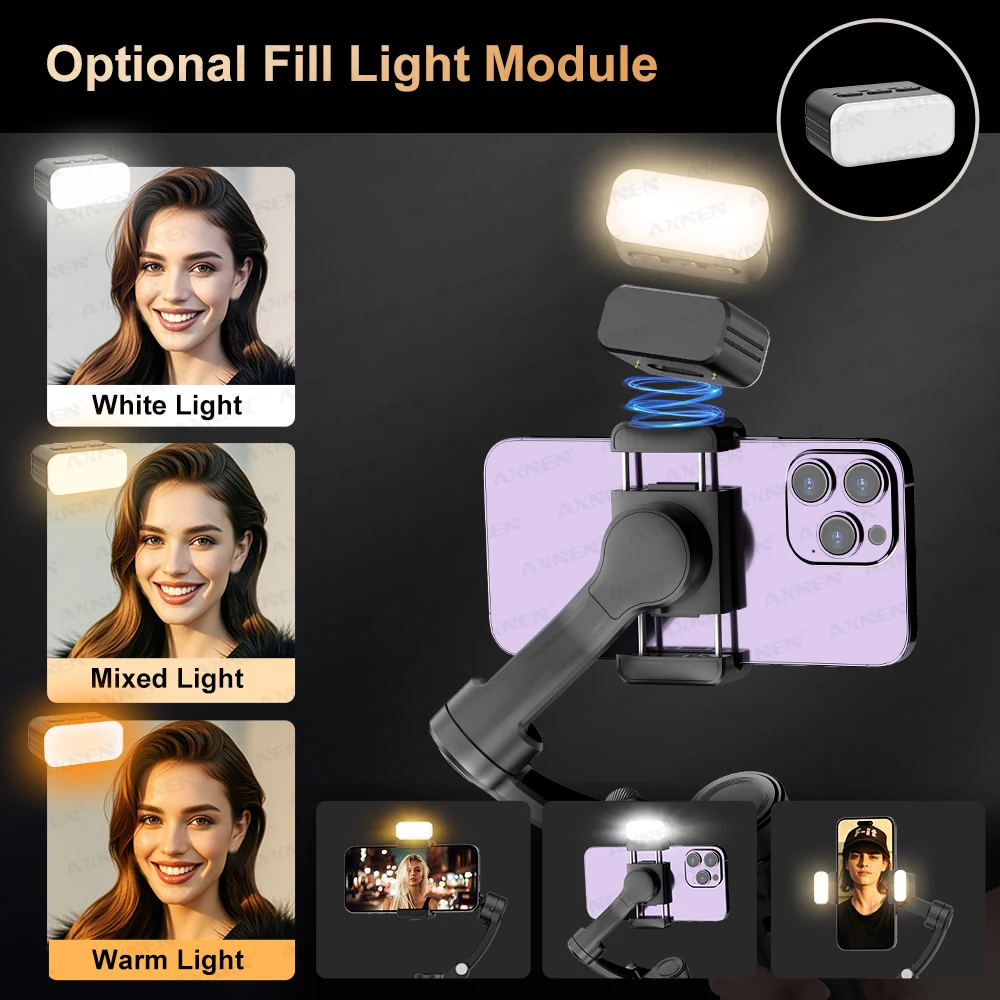 AXNEN M02 can be used with optional fill light, which can be installed on both sides of the phone clip. Each fill light has 3 colors of light, and each color has 3 adjustable brightness levels.
