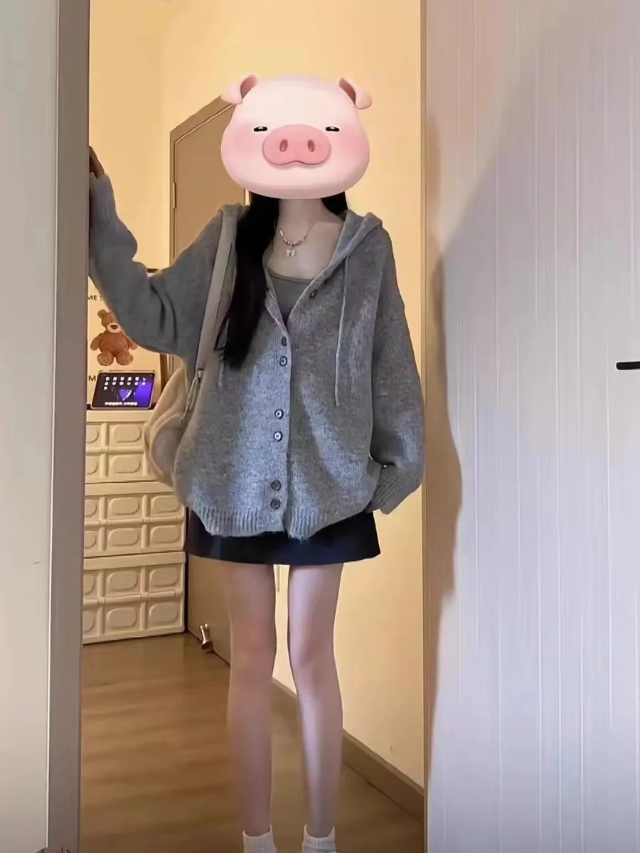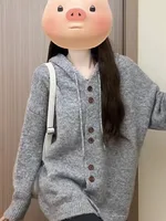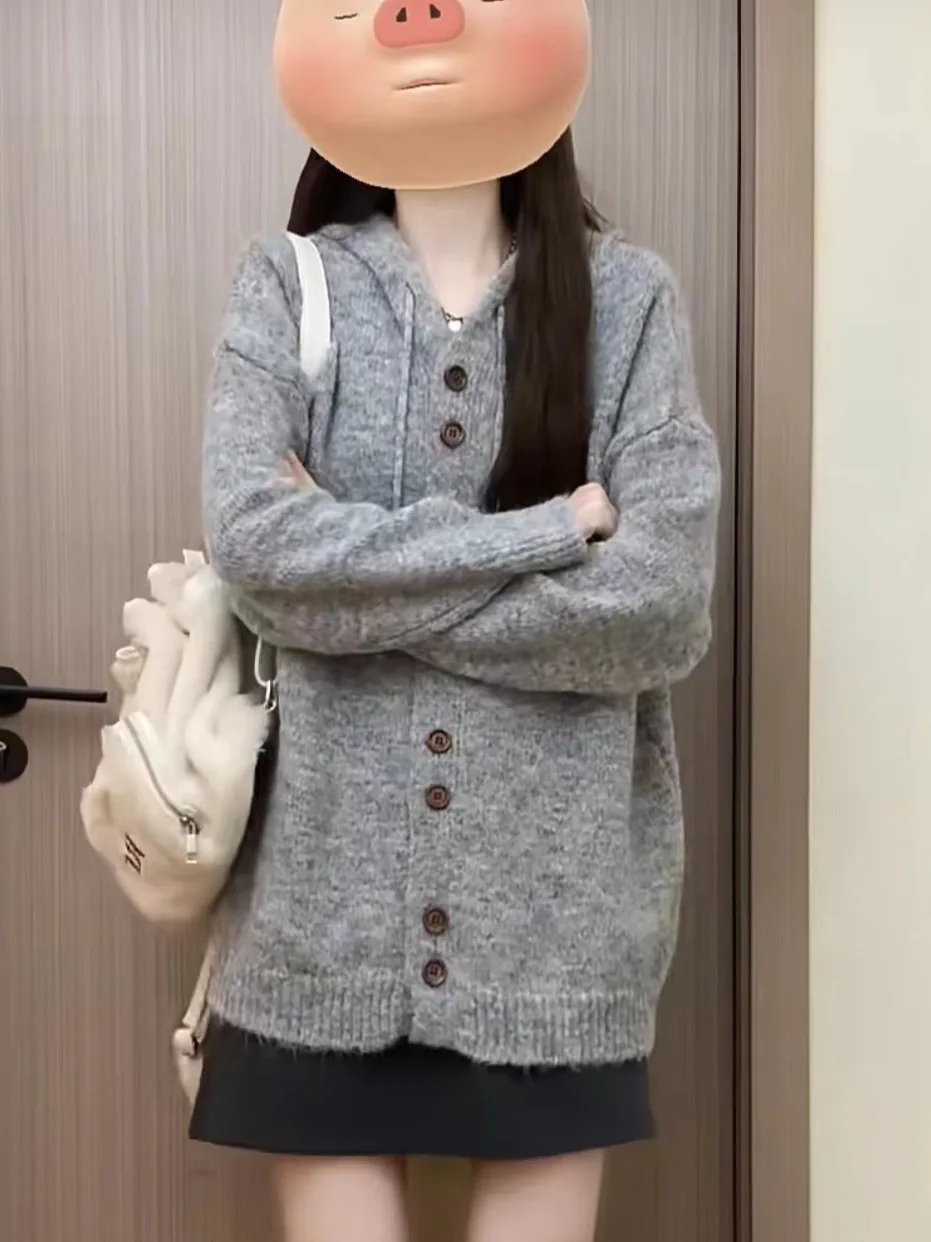 The grey hooded cardigan sweater features a loose fit design, offering comfort and a relaxed vibe for everyday wear.
