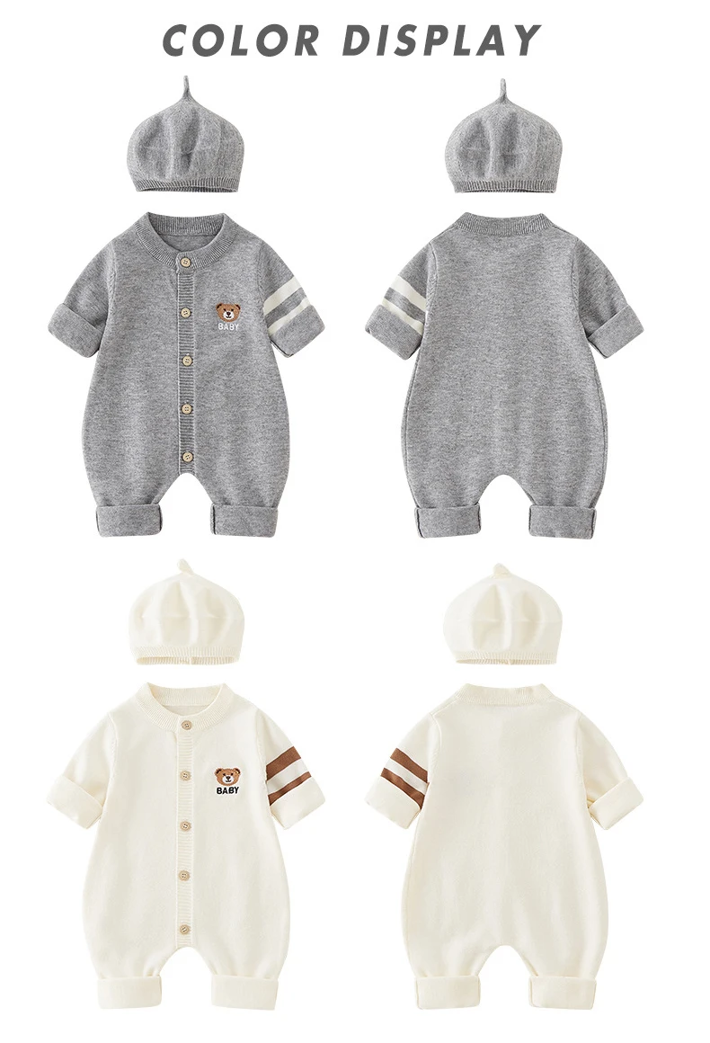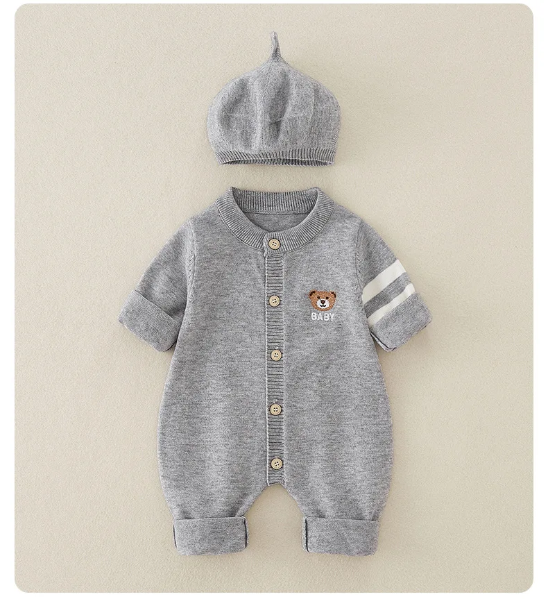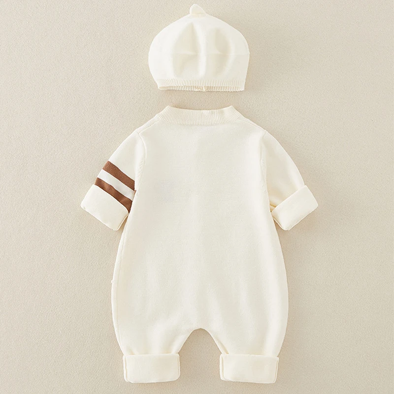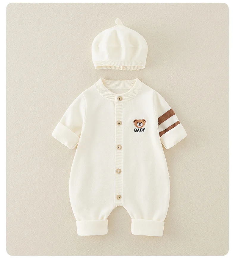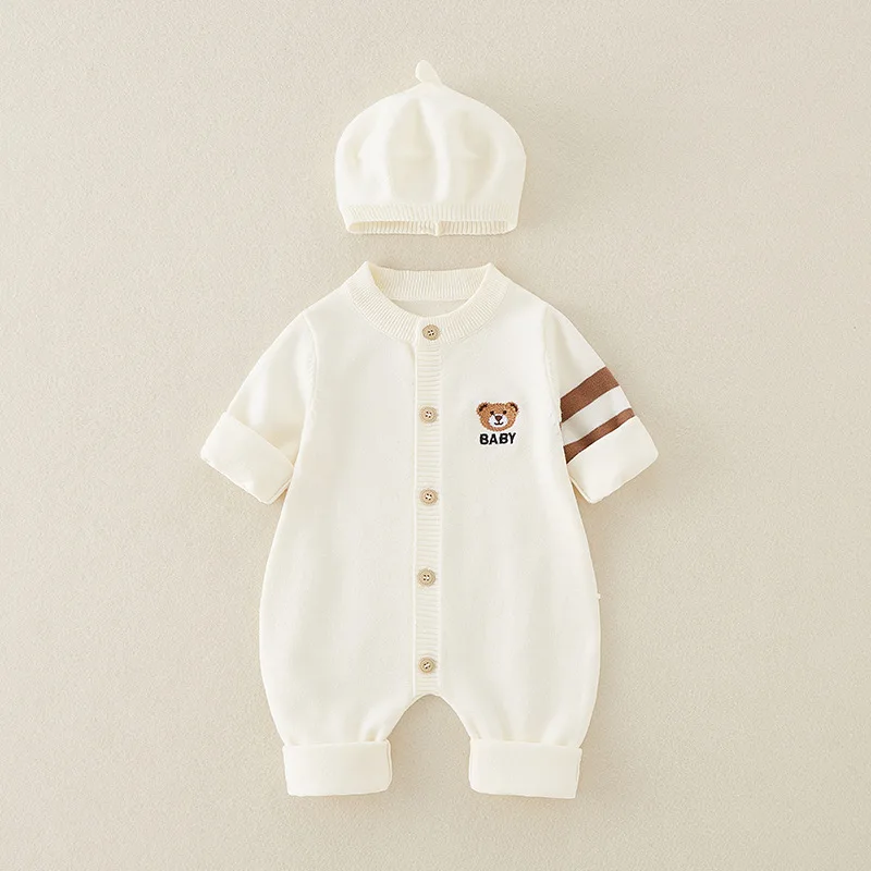 AYNIGIELL Autumn Newborn Baby Jumpsuit Hat 2-piece Set, Korean Version 0-18 Months Newborn Pure Cotton