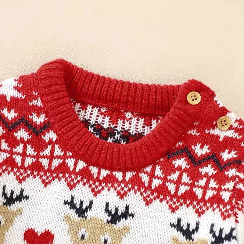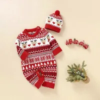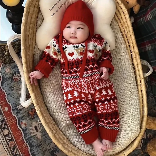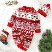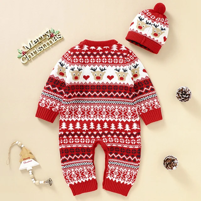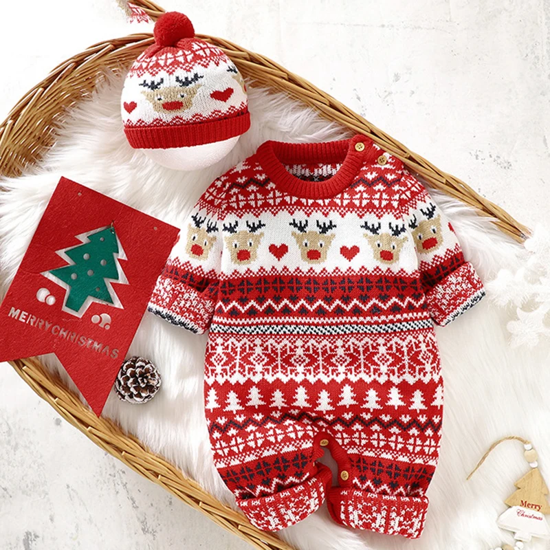 Baby Boy Girl Christmas Romper Knitted With Santa Deer Christmas Jumpsuit +Hat New Year Costume Newborn Knit Christmas Clothes