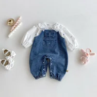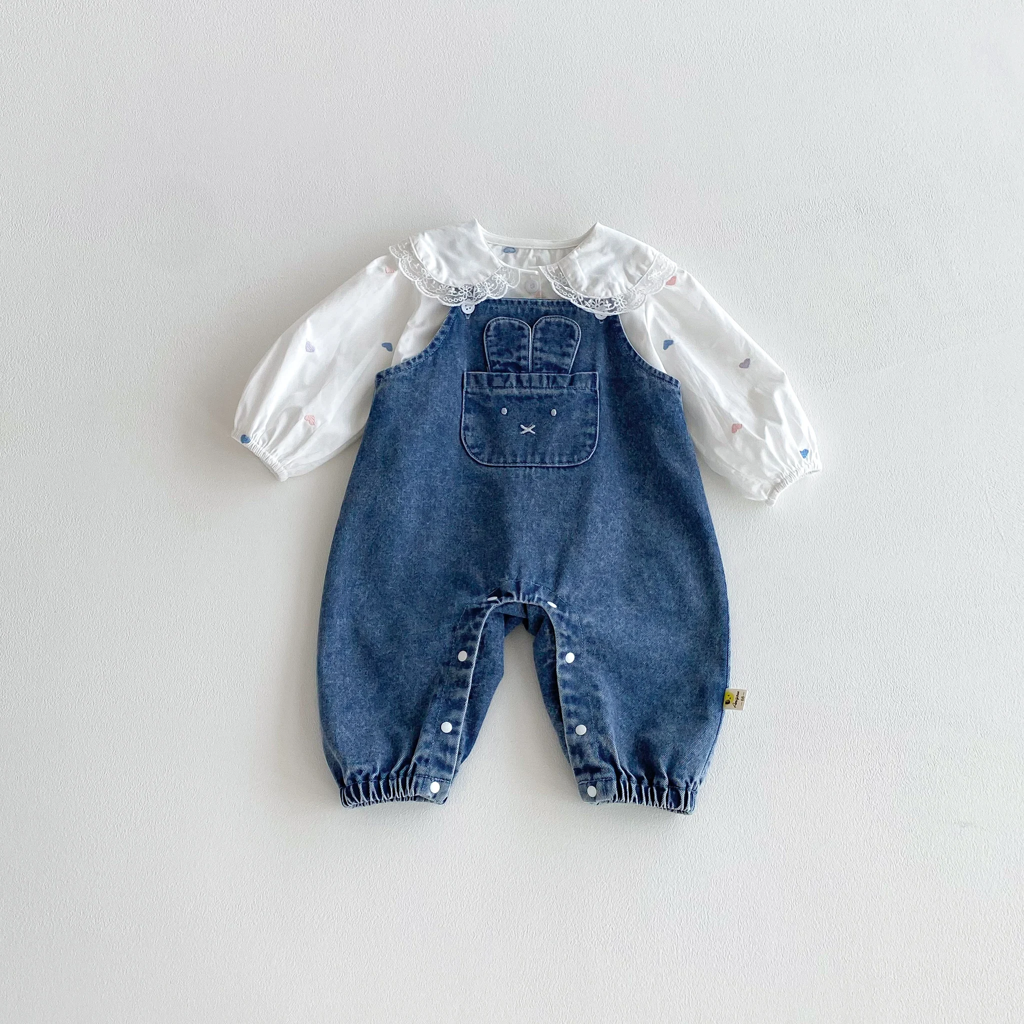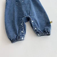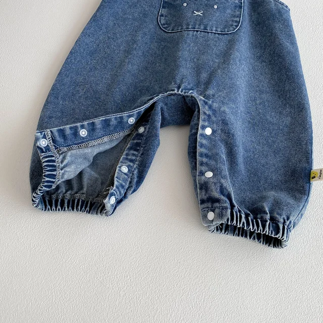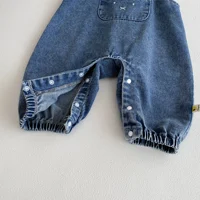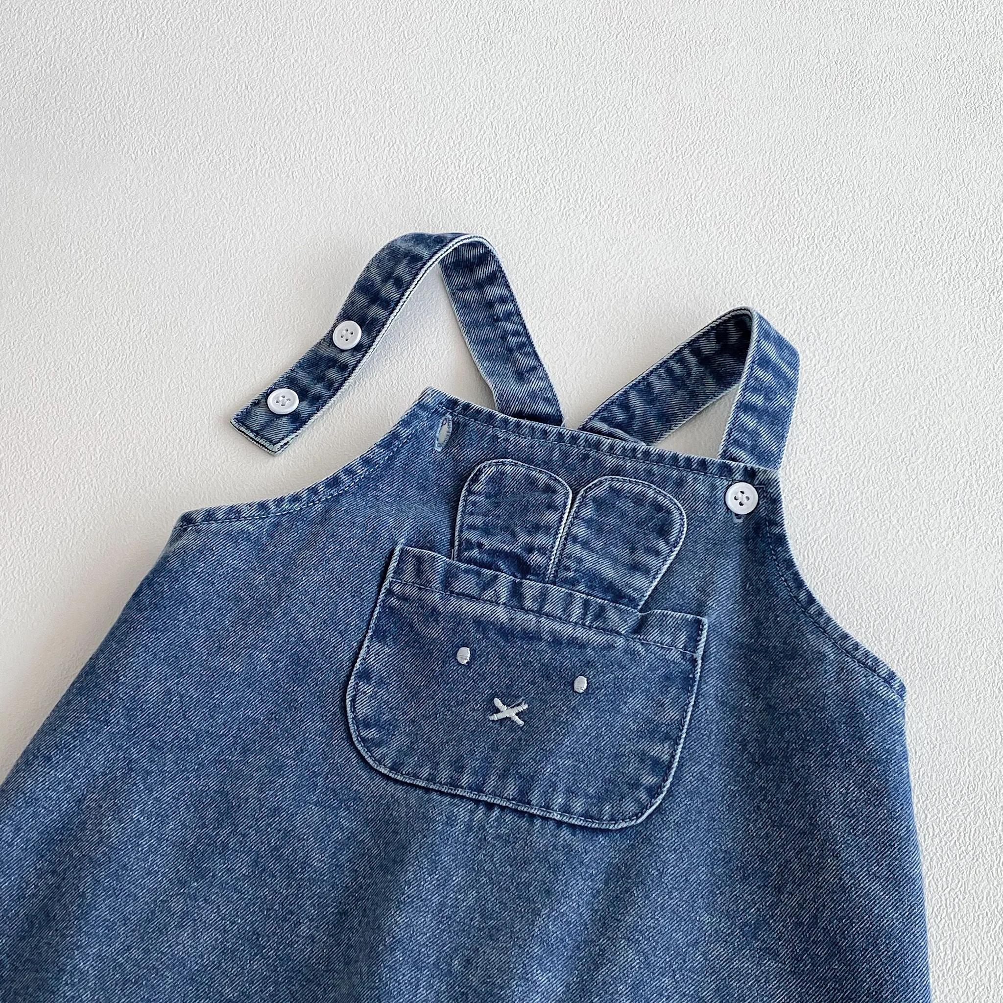 Baby denim overalls, one-piece jeans with large pockets and rabbit ears for outdoor casual wear
