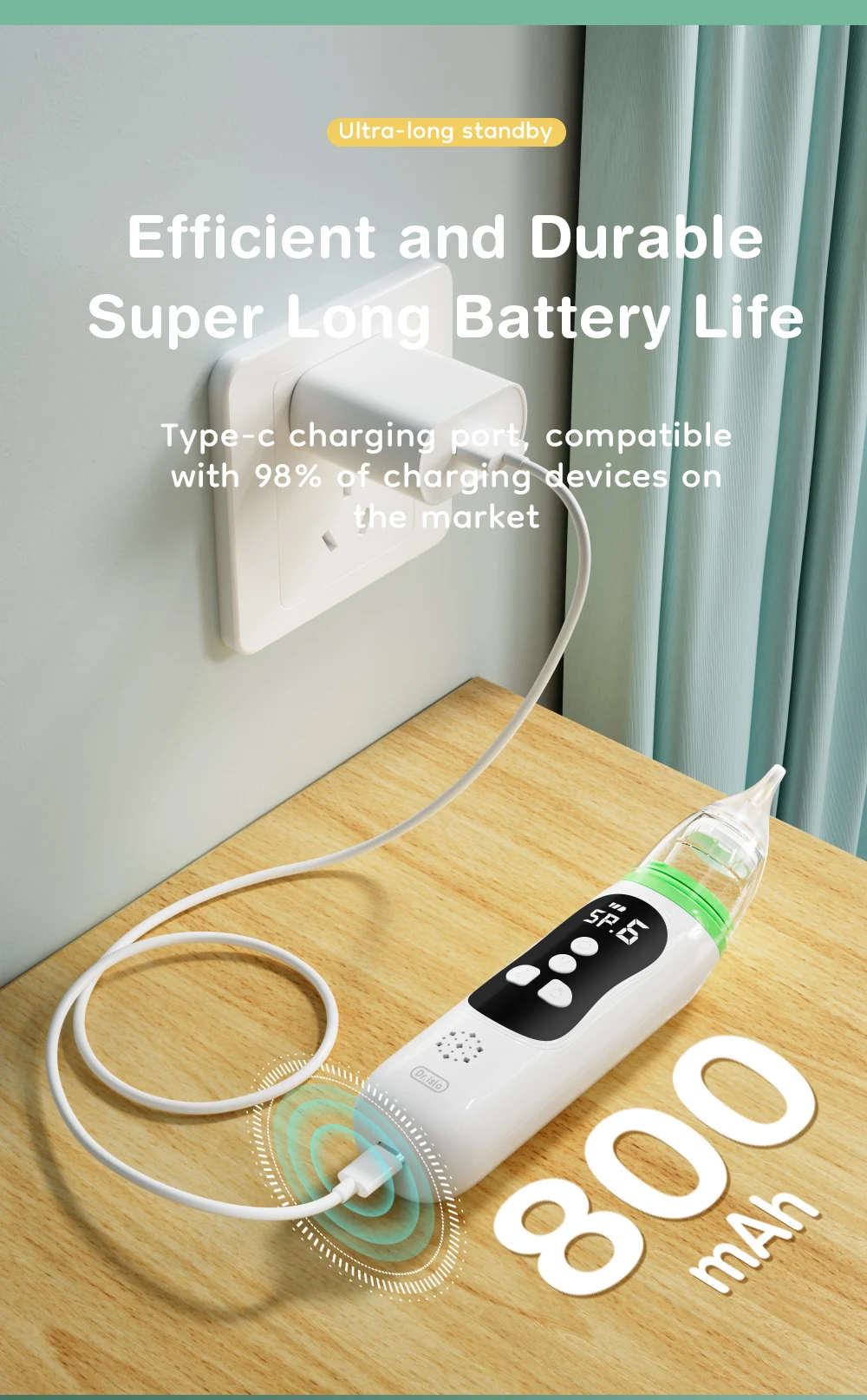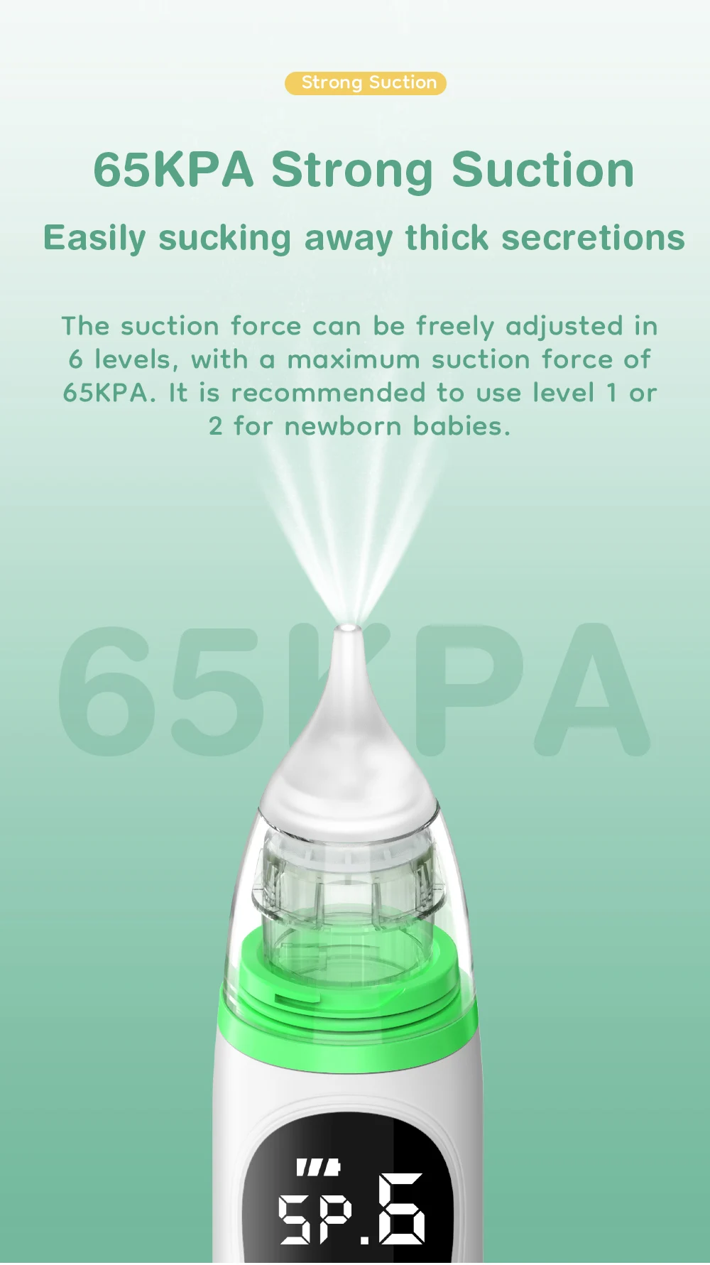 【Strong Suction】 The strong suction of baby nasal aspirator is up to 65Kpa. There 4 modes of suction can be adjusted, which can resolve almost all kinds of snot. (TIP:For stubborn boogers and mucus, soften with Saline Snot Spray first, please wait for 30 seconds to one minute, then suck away with this Baby Nose Sucker)