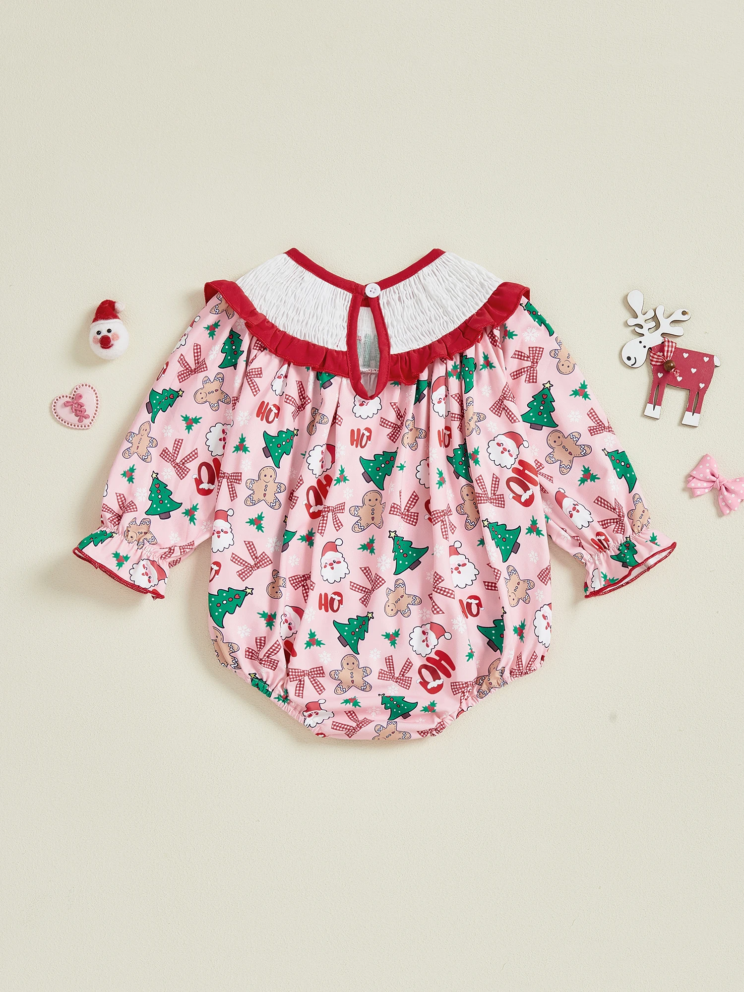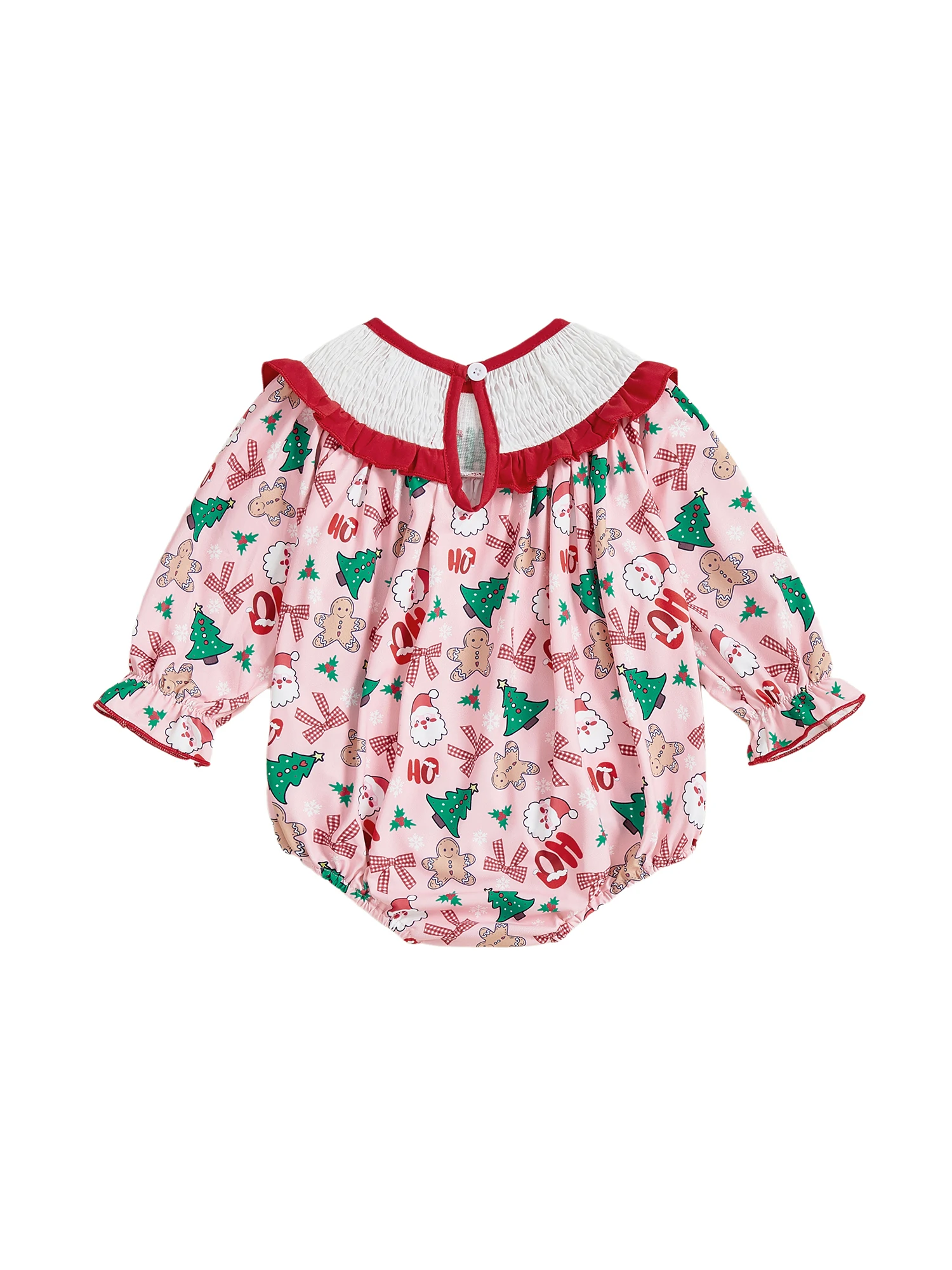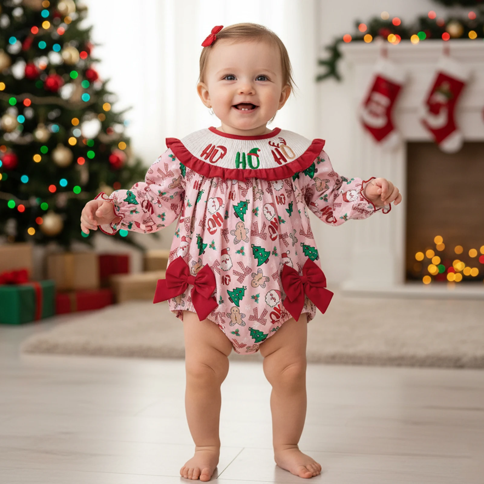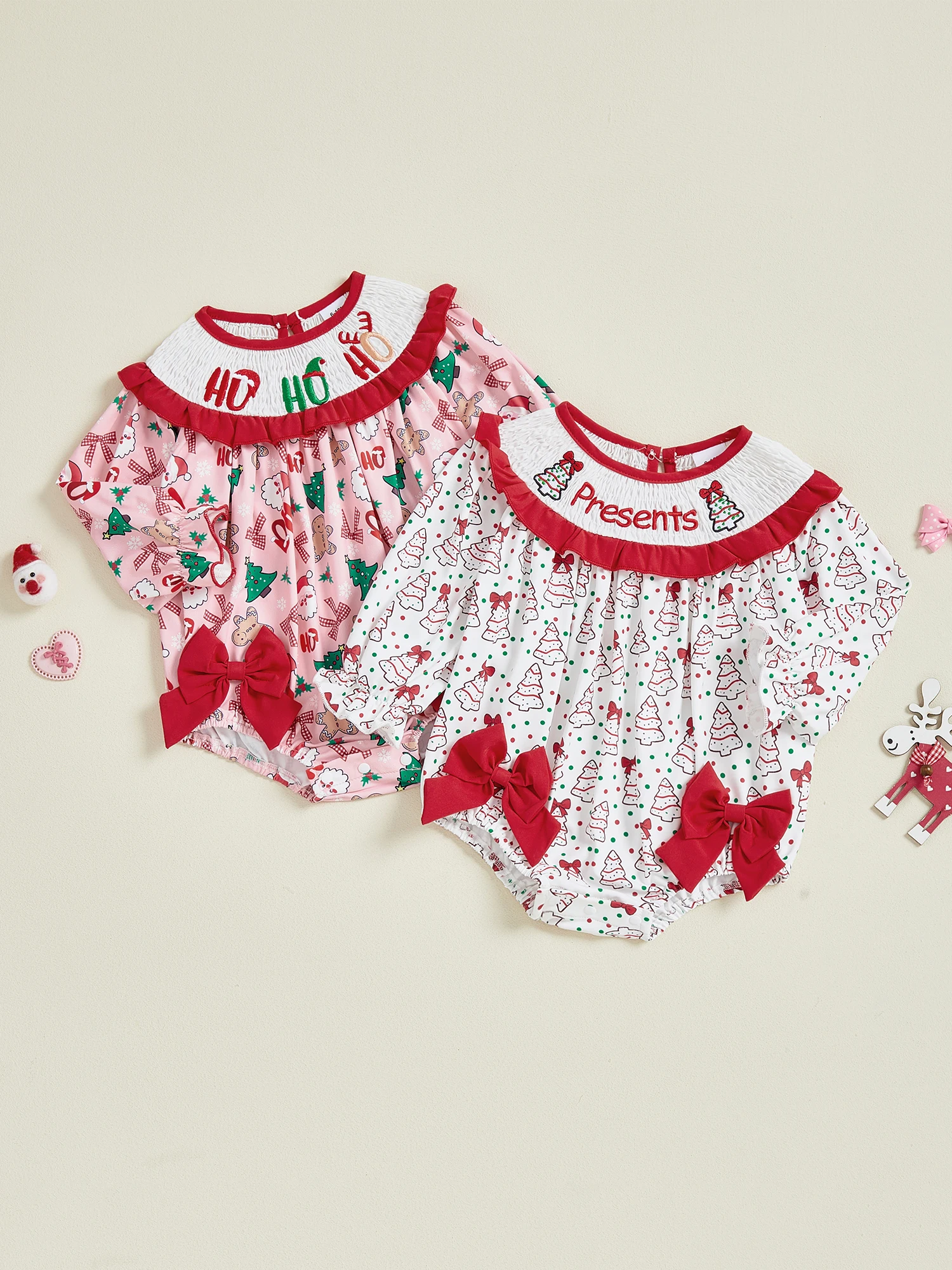 Baby Girl Bubble Romper Fashionable Christmas Tree Embroidery Smocked Long Sleeve Jumpsuit