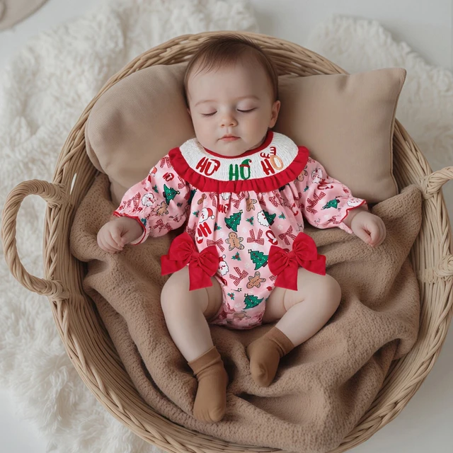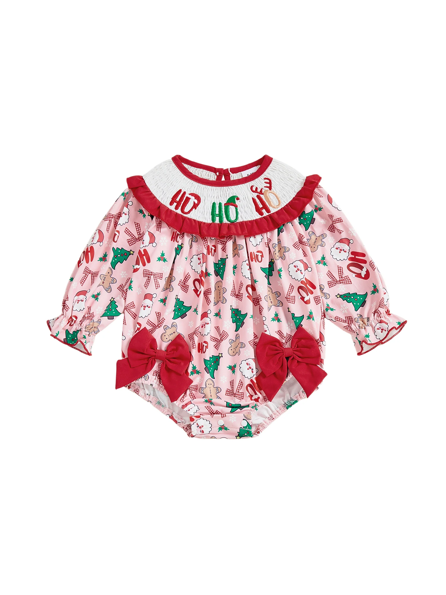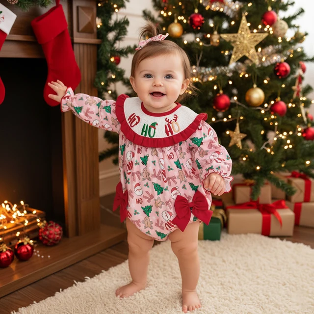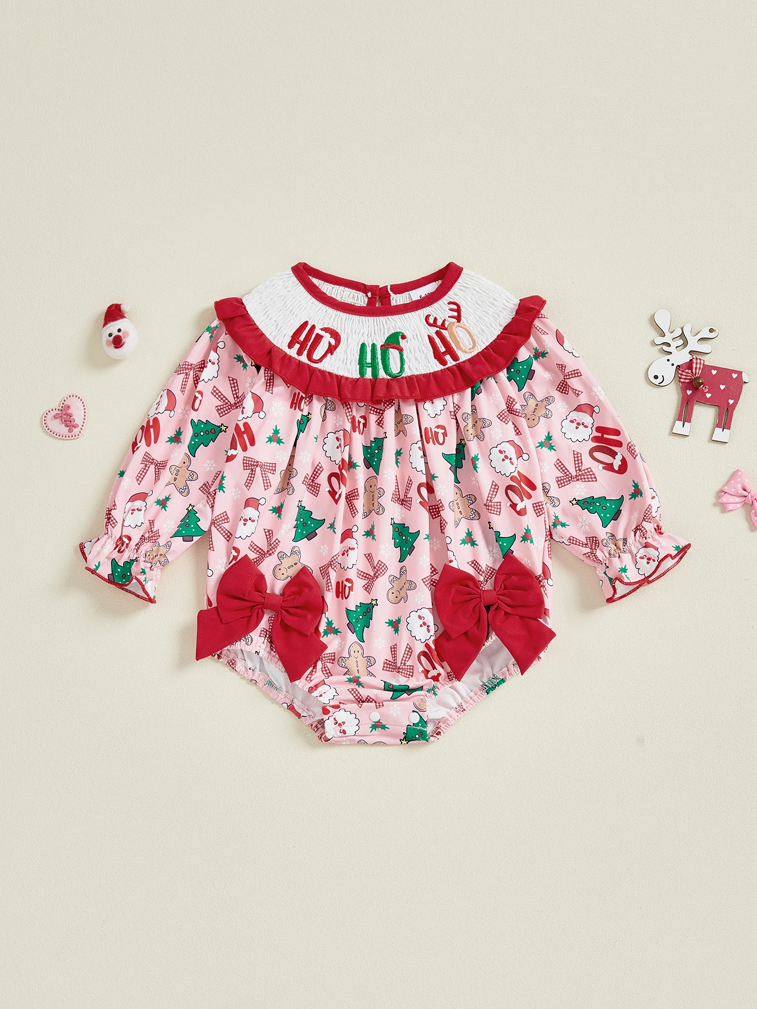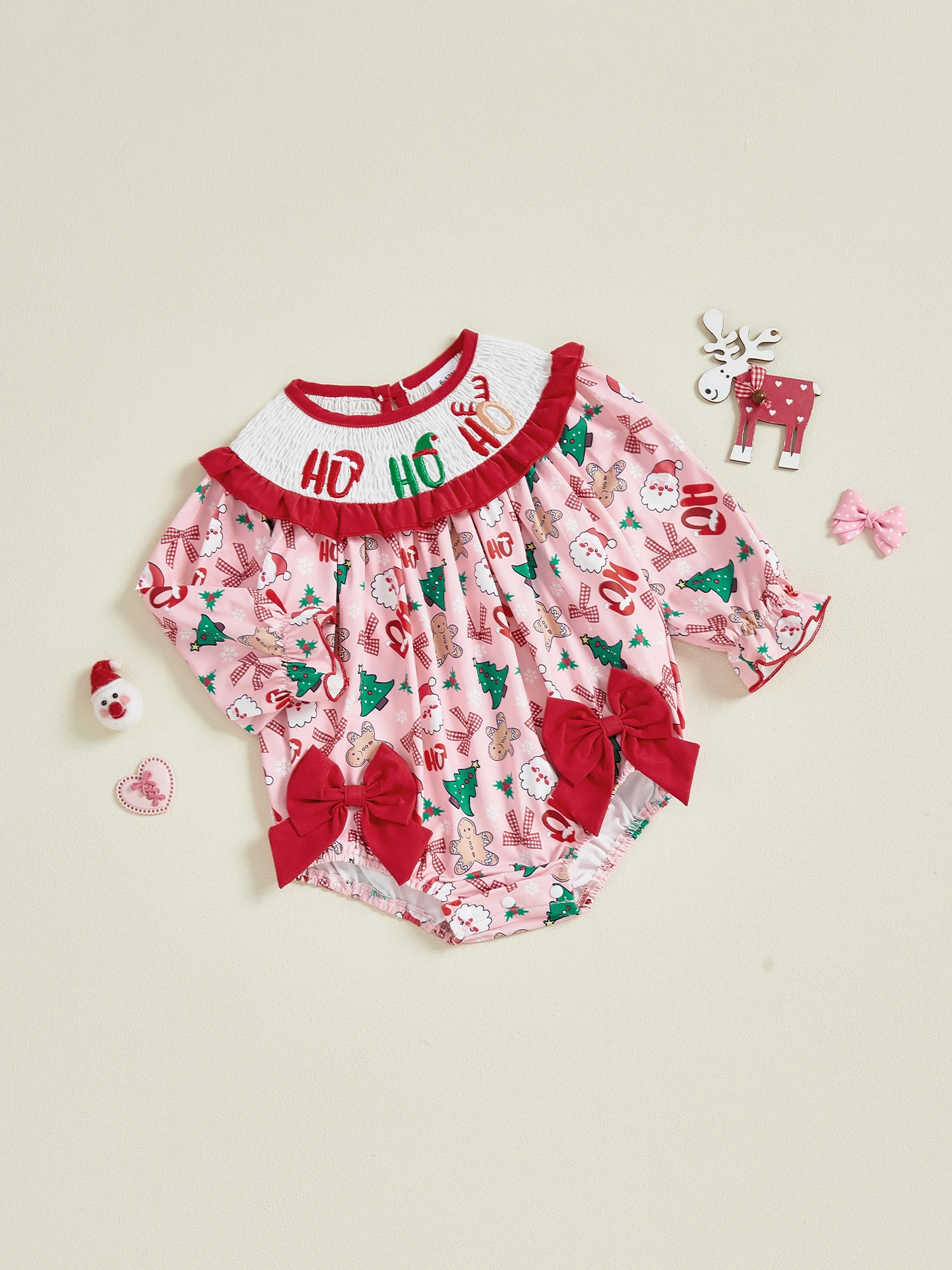 Baby Girl Bubble Romper Fashionable Christmas Tree Embroidery Smocked Long Sleeve Jumpsuit