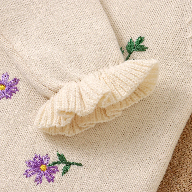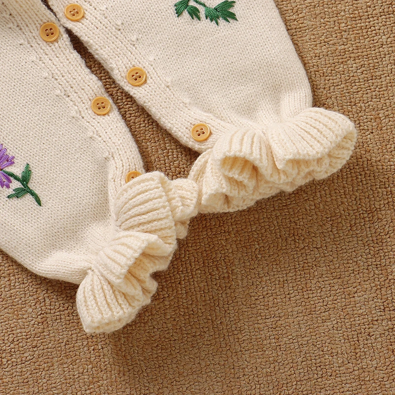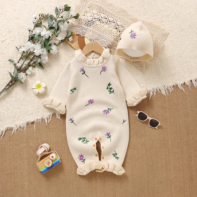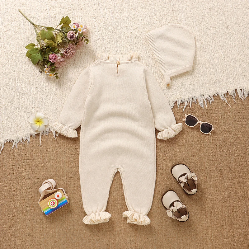 Baby Girls Rompers Clothes Autumn Winter Floral Knit Newborn Babies Long Sleeve Jumpsuits Hats Outfits