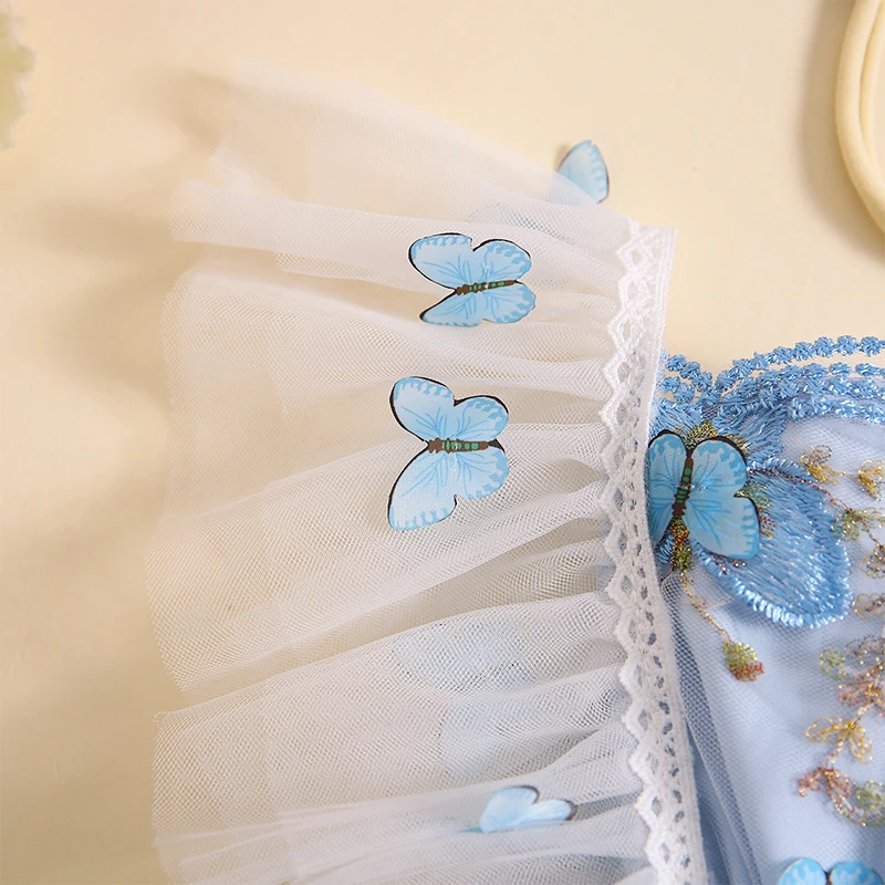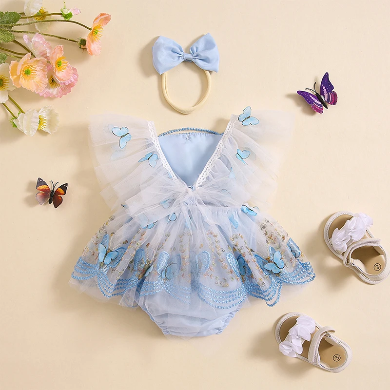 Baby Girls Rompers Dress Lace Trim Butterfly Pattern Embroidered Fly Sleeve Tulle Skirt Hem Bodysuits Clothes with Headband