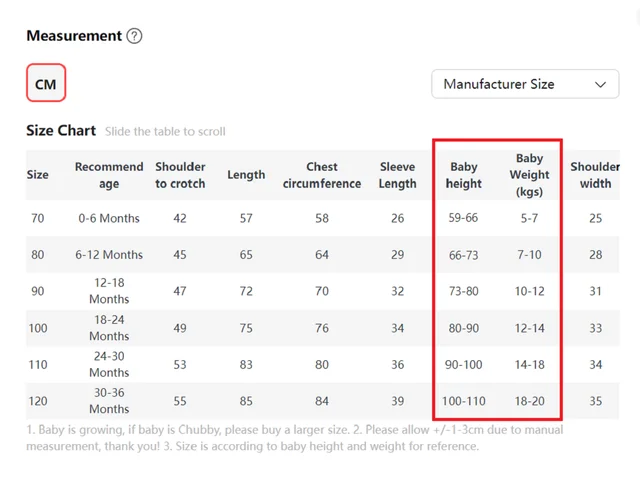 | size_info | {"sizeInfoList":[{"length":{"cm":"0-6 Months","inch":"0.00-6 Months"},"size":"70","vid":-1},{"length":{"cm":"6-12 Months","inch":"2.36-12 Months"},"size":"80","vid":-2},{"length":{"cm":"12-18 Months","inch":"4.72-18 Months"},"size":"90","vid":-3},{"length":{"cm":"18-24 Months","inch":"7.09-24 Months"},"size":"100","vid":-4},{"length":{"cm":"24-30 Months","inch":"9.45-30 Months"},"size":"110","vid":-5},{"length":{"cm":"30-36 Months","inch":"11.81-36 Months"},"size":"120","vid":-6}]} |