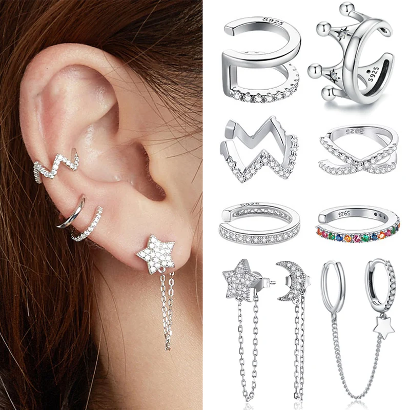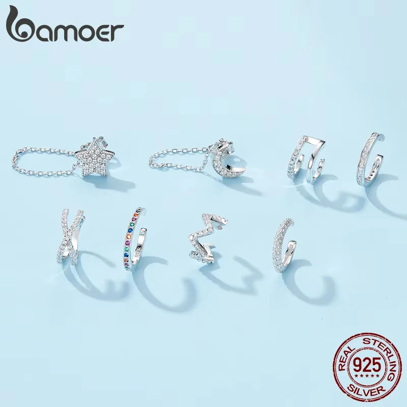 BAMOER 925 Sterling Silver Mono Clip Earrings for Girl CZ Platinum Plated Ear Cuffs Non Piercing for