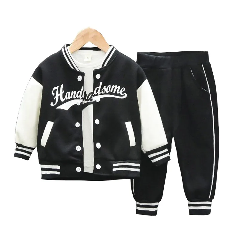 Baseball Coat+T-Shirt+Pant 3pcs Set Kids Boys Girls Spring Autumn Letter Print Sweatshirts Black Sports Casual Outfits Clothes