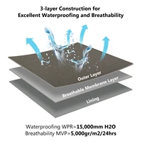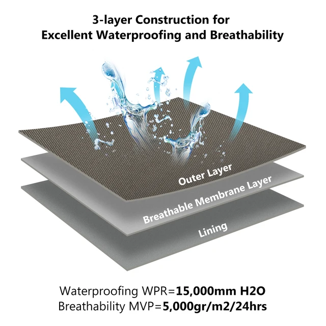 Fabric Type:3 layers of lightweight, waterproof and breathable shell fabric with fully taped seams: Waterproofing WPR=15,000mm H2O, BreathabilityMVP=5,000gr/m2/24hrs