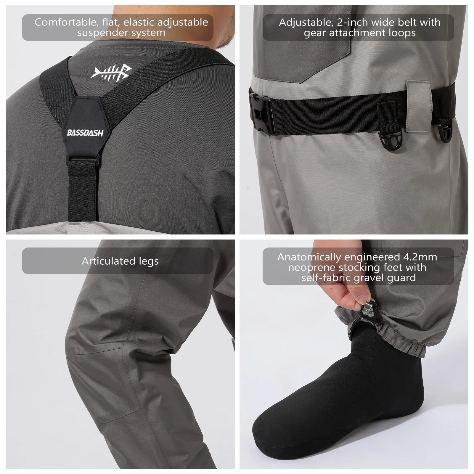 A real redesign of the Bassdash Convertible Waders but with classical elastic adjustable suspenders for easy use and maximum comfort; It still keeps the adjustable, 2-inch wide belt with quick-release buckle and utility loops for gear attachment