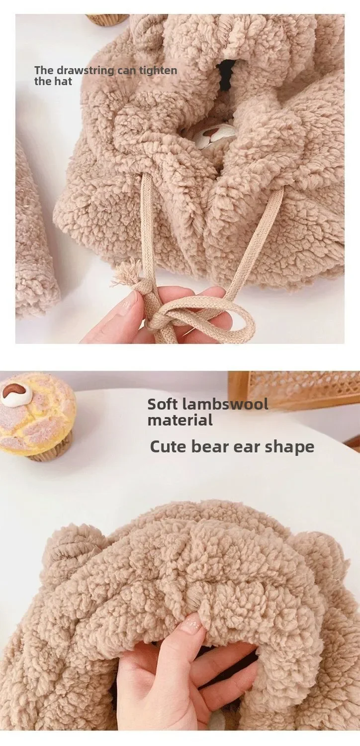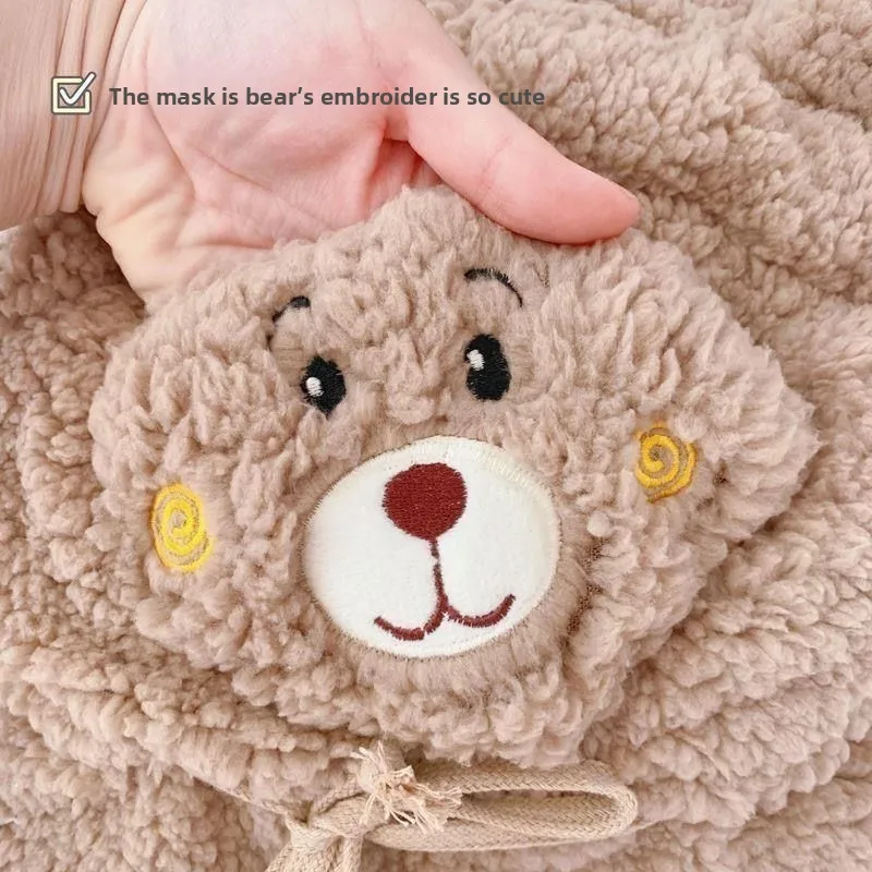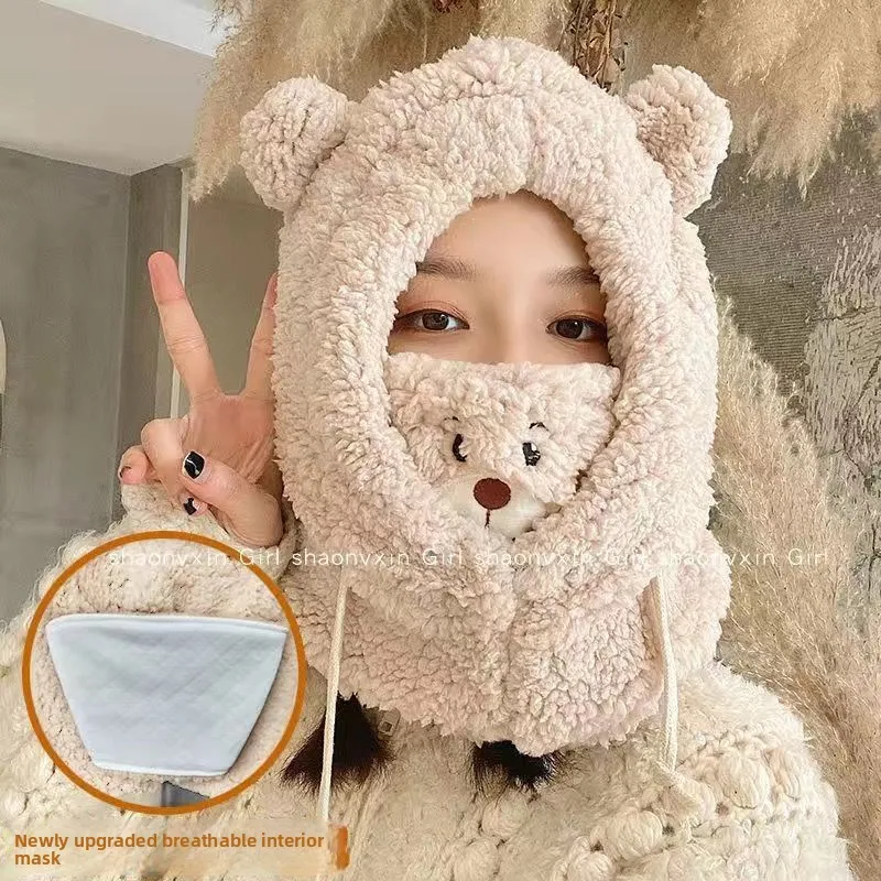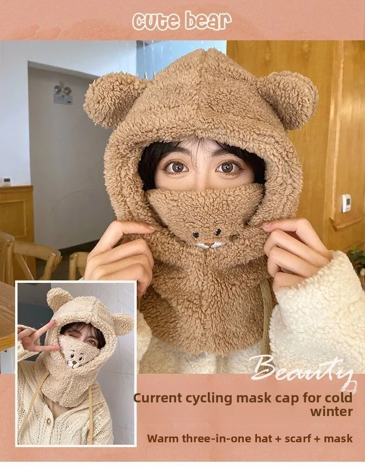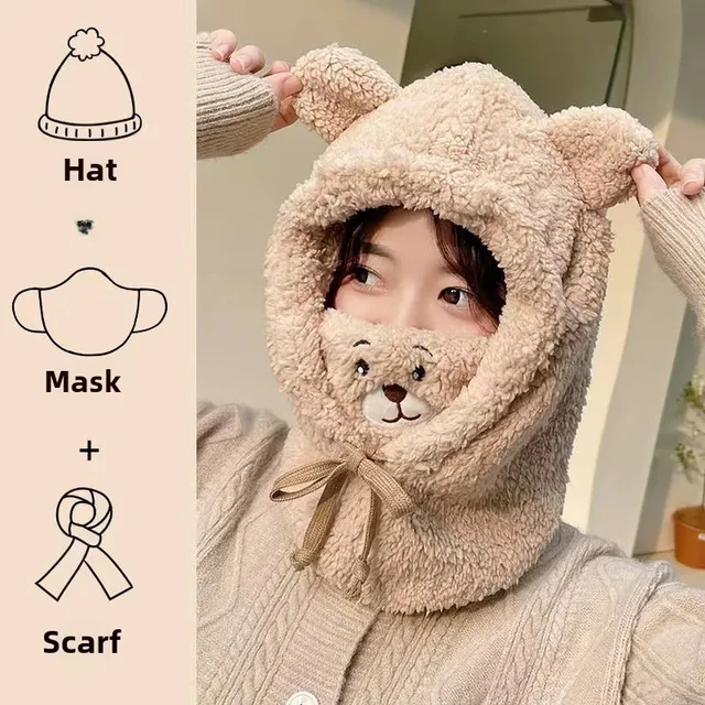 Bear Hat Winter Scarf Mask Set Cute Plush Ear Protection Hooded Scarf for Women Windproof Warm Fleece