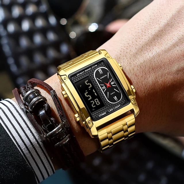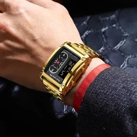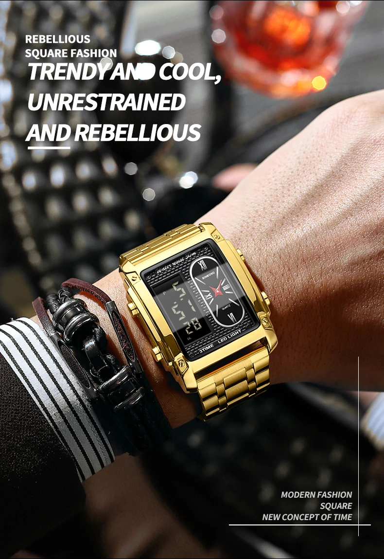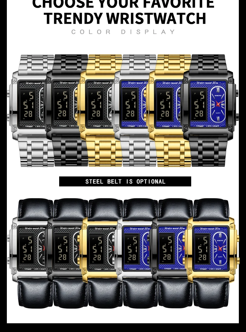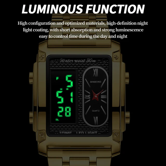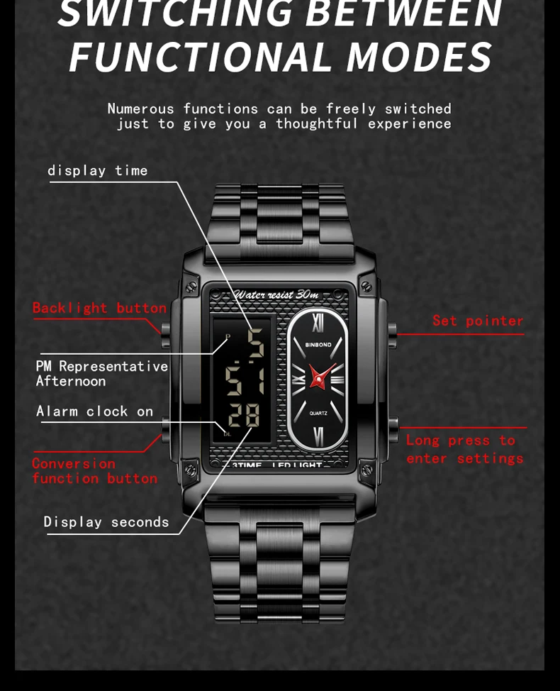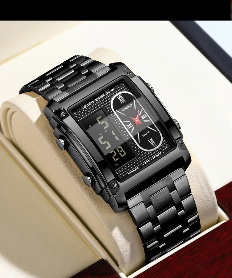 BINBOND Fashion Men Creative Steel Band Quartz Electronic Watch Dual Movements And Multifunctional Waterproof