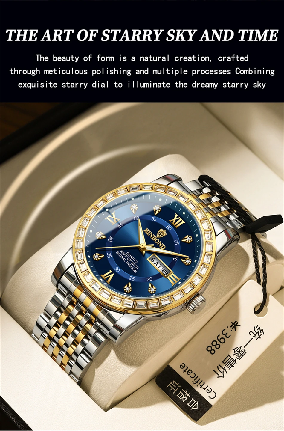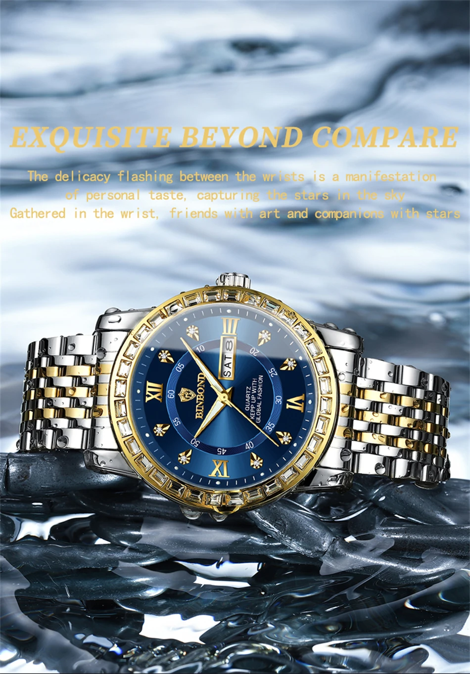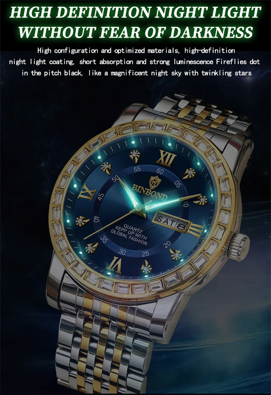 BINBOND Fashionable Men watch trendy business diamond inlaid dual calendar, waterproof luminous quartz