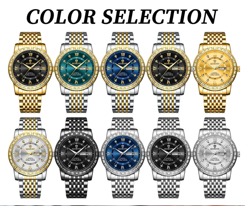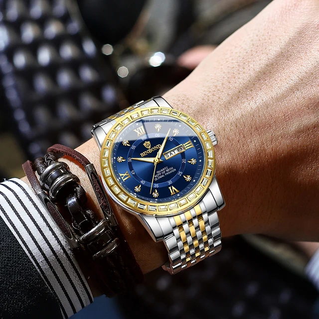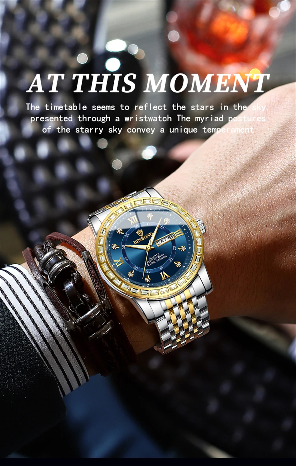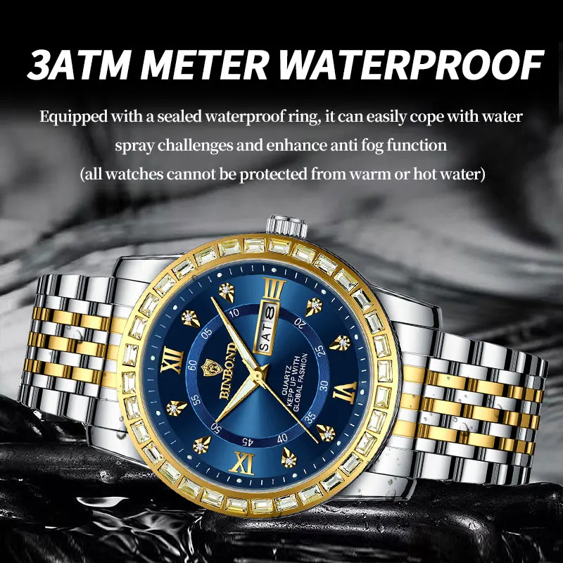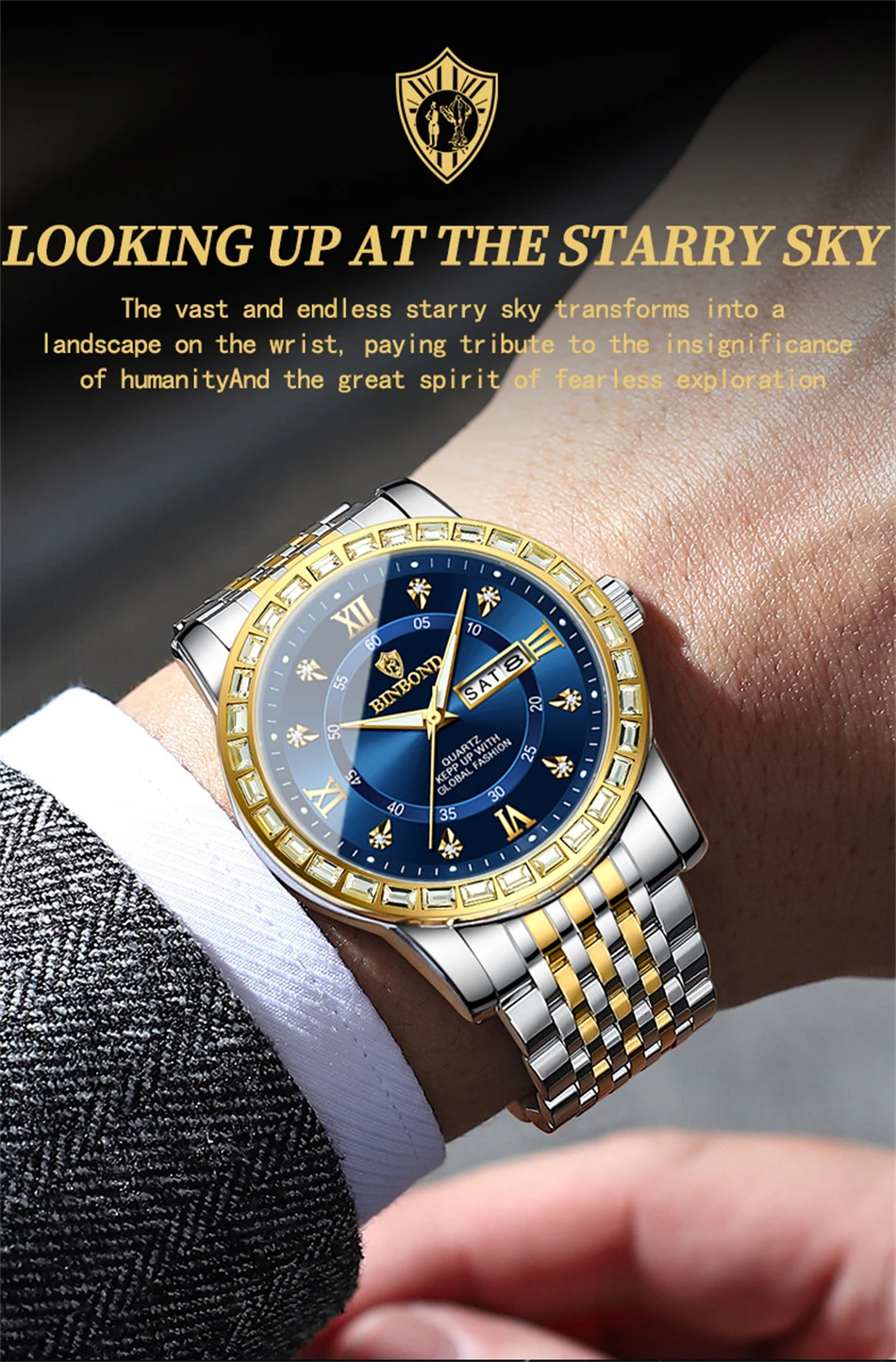 BINBOND Fashionable Men watch trendy business diamond inlaid dual calendar, waterproof luminous quartz