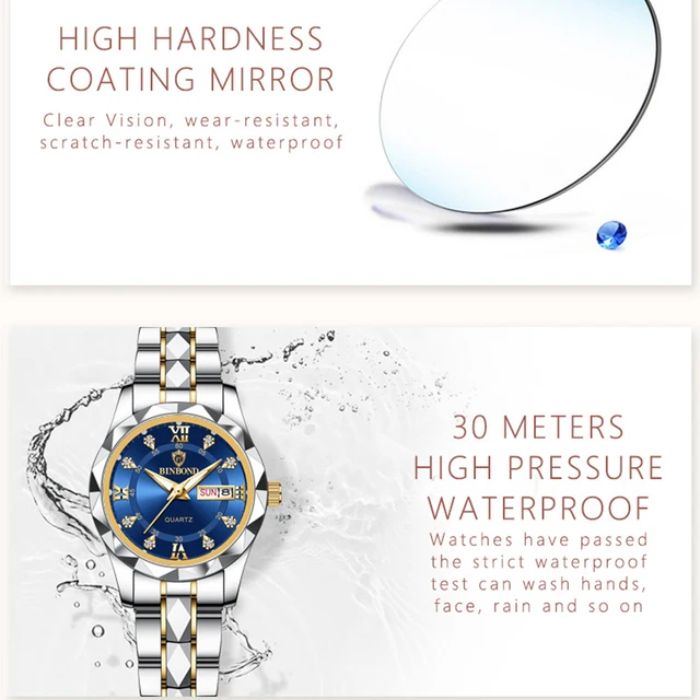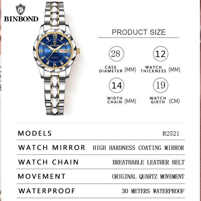 BINBOND Top Brand Luxury Fashion Business Womens Watches 30M Waterproof Week Date Clock Sport Quartz