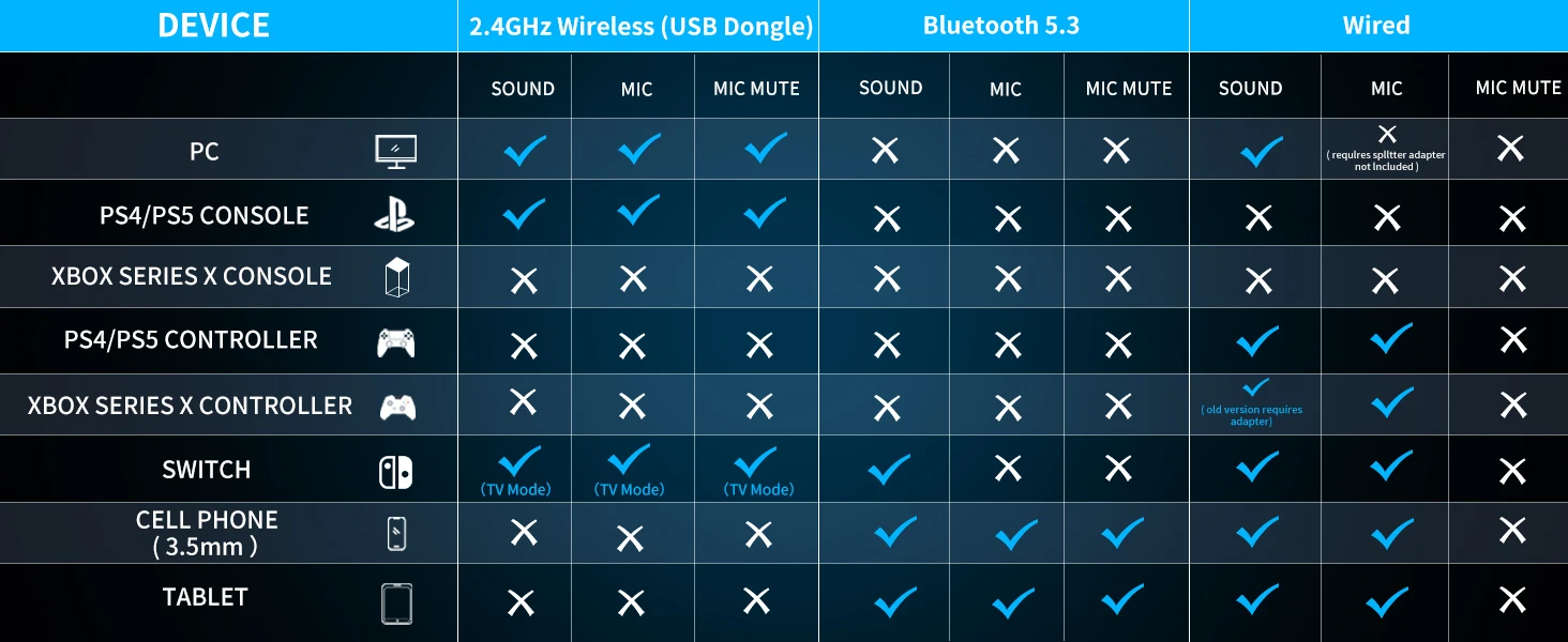 Wide Compatibility: The gaming headsets wireless is compatible with a variety of devices, including PS5, PS4, PC, Mac, mobile phones, and tablets. The ps5 headset wireless also has three modes: 2.4GHz USB adapter, Bluetooth 5.3 and 3.5mm wired connection. The pc headset only supports connecting to PS4/5 in 2.4GHz mode, without audio driver and firmware update. Bluetooth 5.3 mode supports PC, Mac, mobile phone, tablet. Connect immediately without any operation.