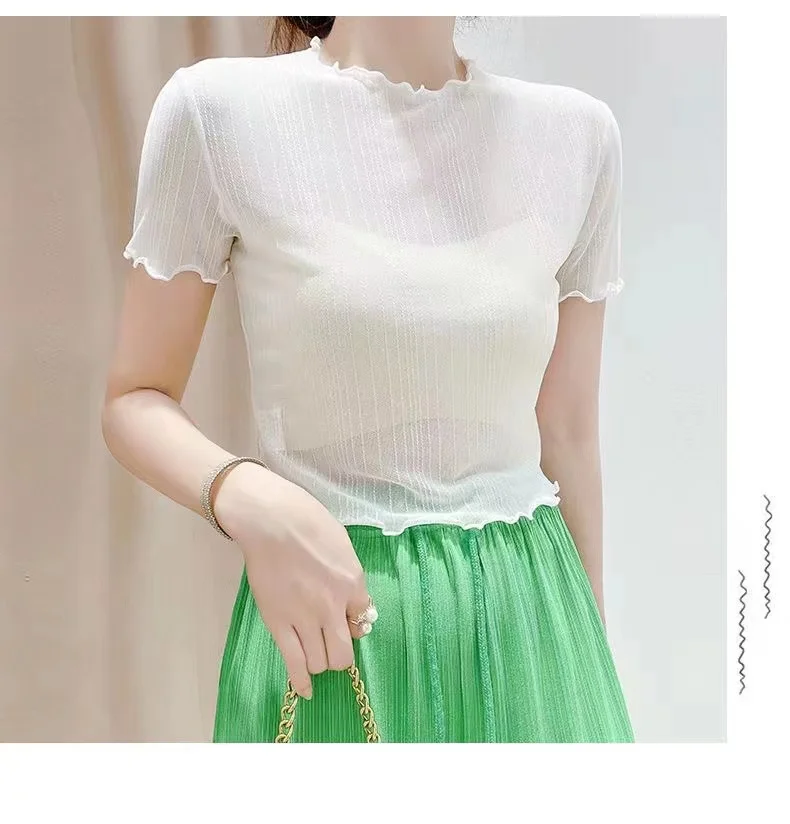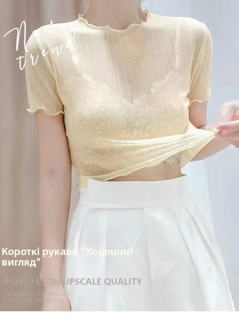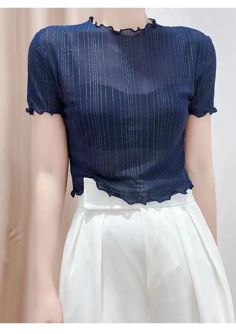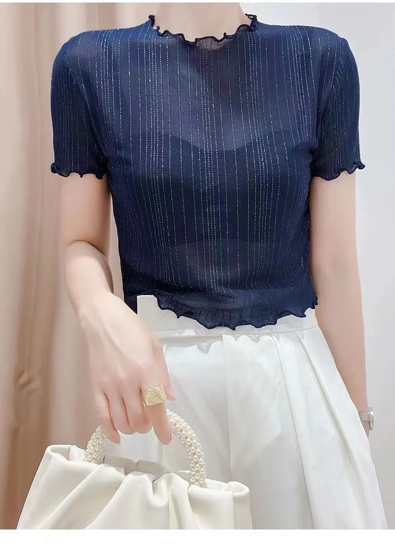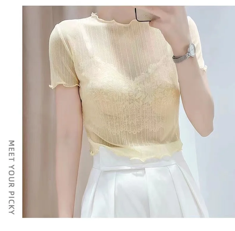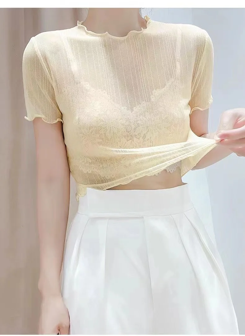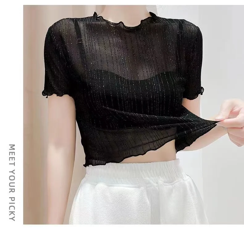 This summer-ready black lace top features a round neck and short sleeves, perfect for warm weather.