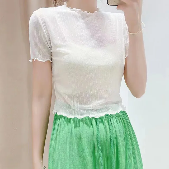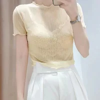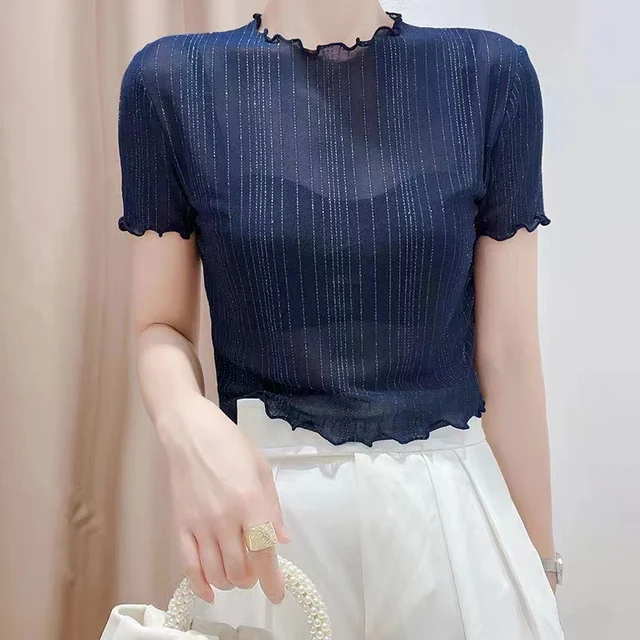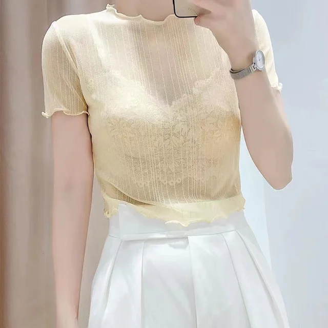 This summer-ready black lace top features a round neck and short sleeves, perfect for warm weather.