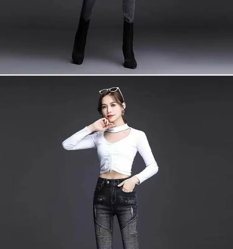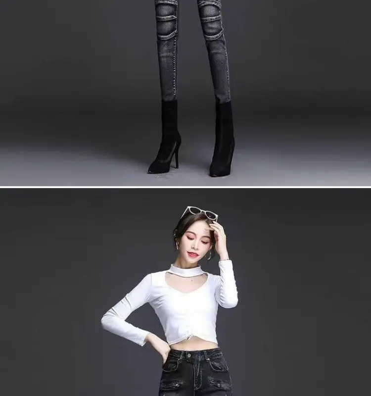 2021 Autumn And Winter High Waist Stitching Dark Denim Skinny Calf Trousers Ladies Fashion Street Casual Black Women's Jeans
